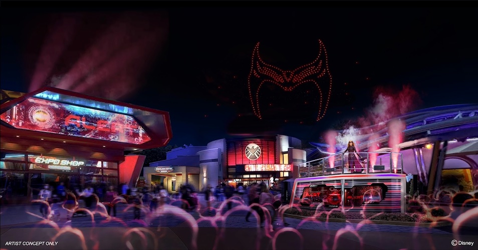 - The acclaimed nighttime drone spectacle enchants Tomorrowland with an innovative narrative featuring a new adversary, The Scarlet Witch, who unleashes chaos magic at Stark Expo.