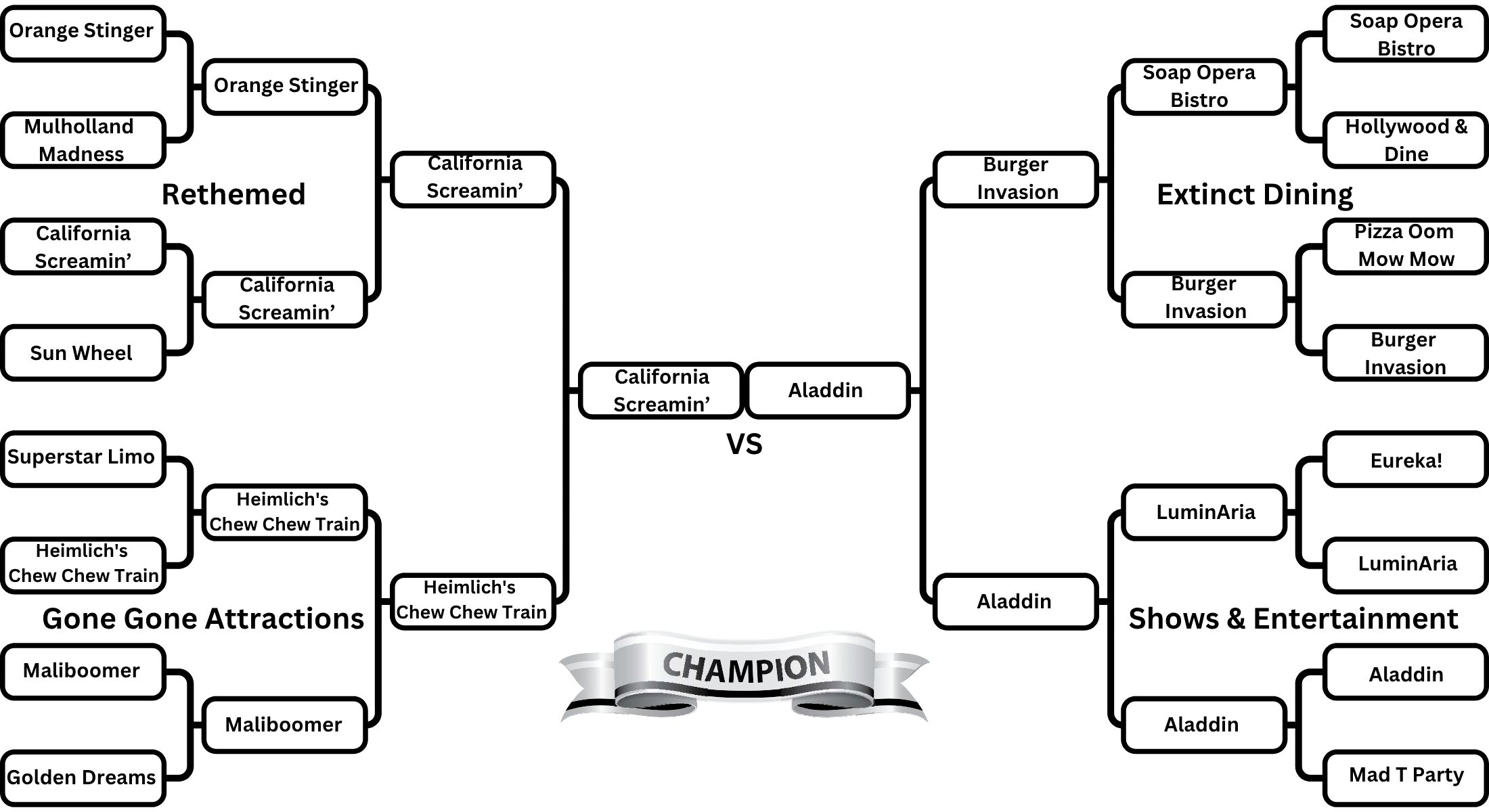 With that, it's time for the grand finale. On one side, we have the beloved but since rethemed California Screamin'. On the other side, the long-running Aladdin: A Musical Spectacular.