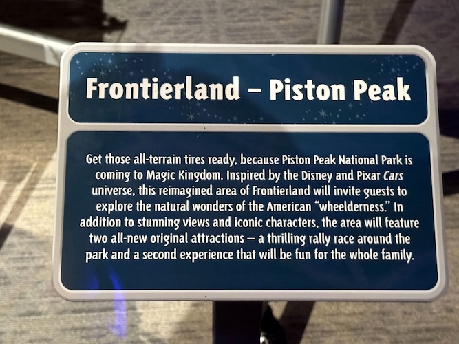 Finally, we come to Piston Peak — which is the Cars area racing to Magic Kingdom. As previously announced, this sub-section of Frontierland will take inspiration from National Parks. In turn, Disney has introduced a new Ranger character named J. Autobahn Woodlore, paying homage to J. Audubon Woodlore who appeared in several animated shorts alongside the likes of Humphrey the Bear and Donald Duck. This character can be seen in the corner of the map on display.