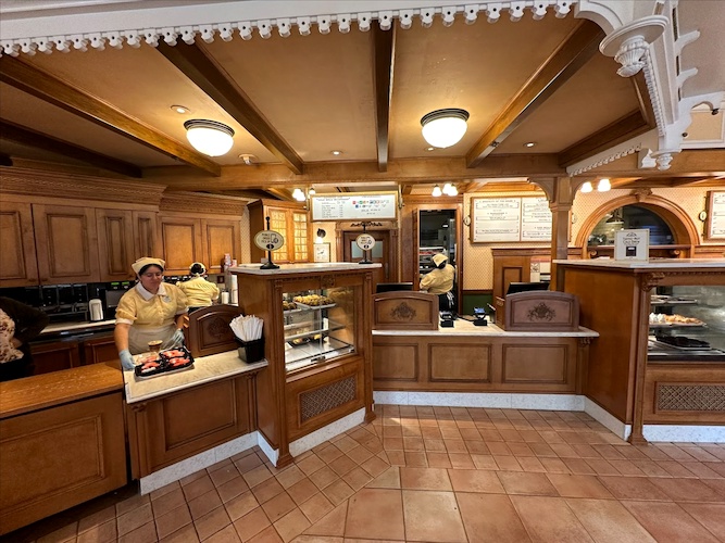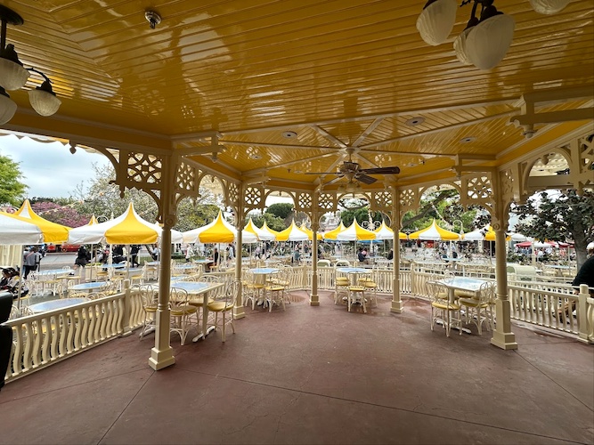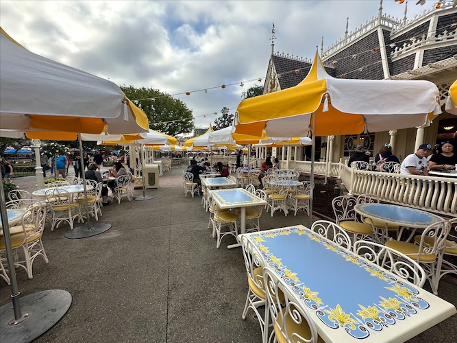 Seating is all outdoors, with bright yellow and white umbrellas that keep the Main Street U.S.A. dining locations all within a cohesive aesthetic.