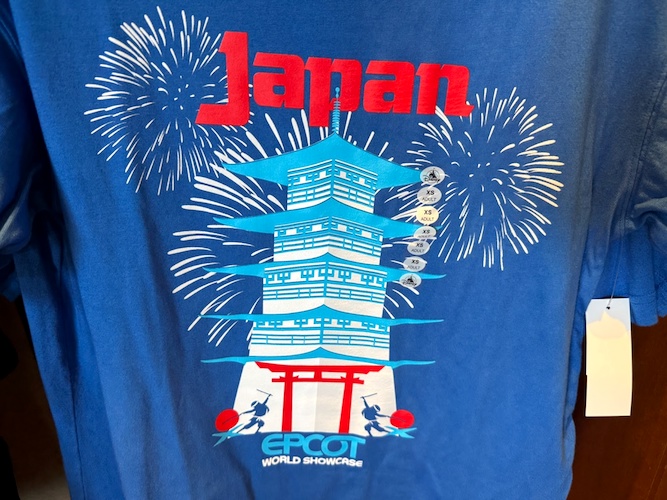 There is no movie-specific imagery for the new Japan shirt, but rather the area’s distinctive Japanese pagoda and torii gate are included, backed by fireworks forming a Mickey shape.
