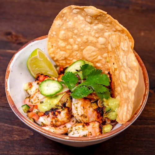 - Shrimp Ceviche: Shrimp, aguachile marinade, salsa macha, and guacatillo with tostadas