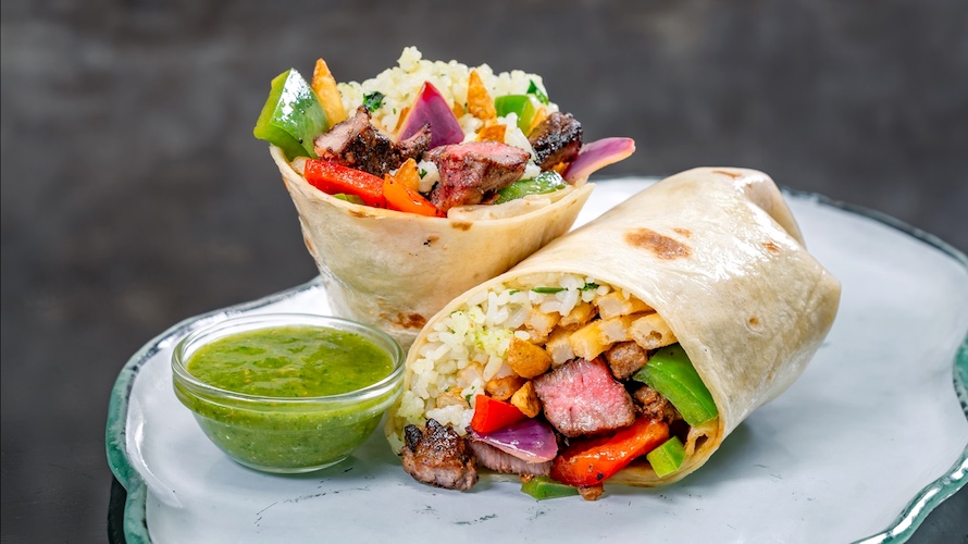 Peruvian-inspired lomo saltado stir-fry, shoestring french fries, and serrano-lime rice wrapped in a warm flour tortilla and served with serrano hot sauce.