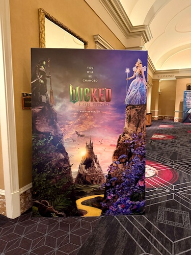 The cast and creative team - Cynthia Erivo, Ariana Grande, Jon M. Chu, and Marc Platt - returned to the CinemaCon stage to preview Wicked: For Good. They discussed the continuation of the story into the second act, which goes beyond the events of The Wizard of Oz and introduces moments not seen in the original stage musical. A reel of footage - some new, some previously shown - highlighted Glinda standing on a balcony in the Emerald City wearing a white wedding dress, calling out into the night for Elphaba. Elphaba appears behind her, setting the stage for a tense confrontation.