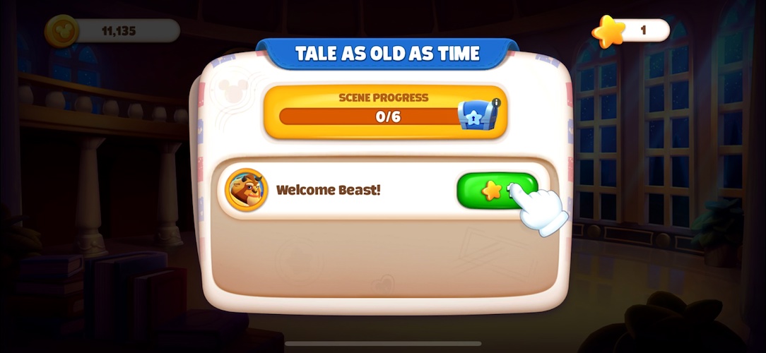 Back to the story, as you complete levels, you’ll collect stars that can then be used to add to the scene. For example, in this first scene, I was able to use my stars to decorate the ballroom and, eventually, activate Belle’s grand entrance. Once I’d completed all of the levels in the scene and redeemed my stars, the power couple even shared their iconic dance. And with that, I was off to the next scene, The Little Mermaid.