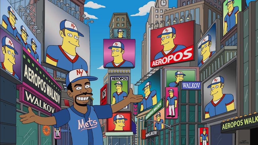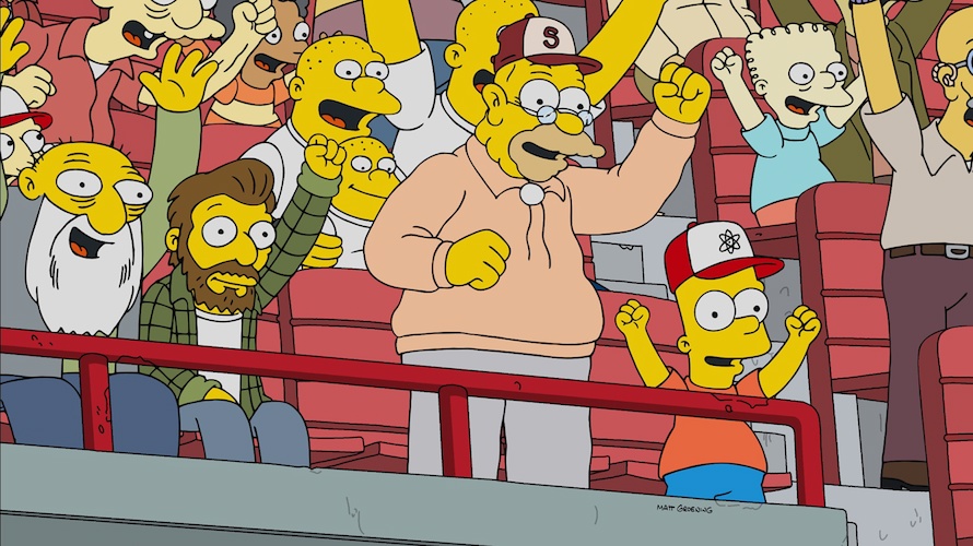 Moe, meanwhile, acts as Walkov’s interpreter for press conferences and other interactions with the locals. But the problems begin to arise when Abe becomes frustrated by the increased commercialism of the now-booming Isotopes ballpark– now renamed Toblerone Stadium– and the transformation of his usual seats into a lush VIP area that he and Bart can’t even access: their section “J" has been relocated the the super-nosebleeds above the clouds and the Duff blimp. Then Moe encounters an issue of his own when he finds Walkov betting on baseball using one of the many sports-betting apps that are being advertised around the stadium. Bart also becomes enamored by sports betting when he sees his heroes doing it, using Homer’s unconscious face to log in to his smartphone. This leads to a tense press conference wherein Moe attempts to mistranslate Walkov’s confession and Abe eventually confronts his still-relatively-new bartender friend.