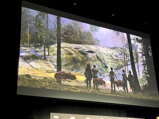 The early paintings set the tone - a Star Wars suburbia with mobile homes crafted from repurposed ships, 1980s-style hover bikes, and overgrown forests hiding mysterious vessels. Chiang said one key piece, showing the kids discovering the buried ship, “could be the movie poster for the series." The aesthetic leaned heavily into Spielberg nostalgia, complete with golden hour lighting and magical mystery. “At first glance, it could be any ordinary Spielberg film," Chiang added. “But then you notice there’s a blue elephant kid running down the street."