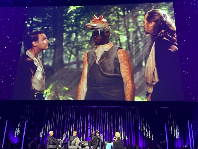 Eckstein steered the conversation to the artistry behind these characters. Daniels described how C-3PO’s nervous voice was born on the first day of filming in the desert, surrounded by heat, sand, and uncertainty. “He arrived with the grace of the Force," Daniels said, revealing that even George Lucas hadn’t initially planned to use his voice. He shared that the same was even true of Frank Oz’s voice for Yoda, and Ahmed Best didn’t know his voice would be used for Jar Jar Binks until the first table read for The Phantom Menace.