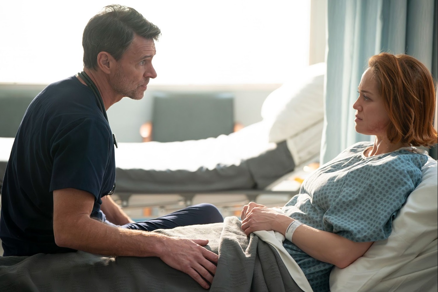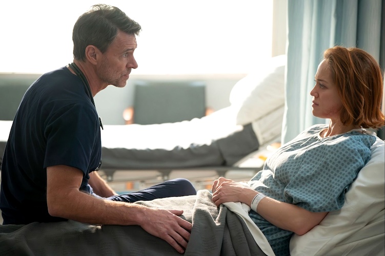 After getting beaten up in a bar, Angie Polaski (Erika Christensen) finds herself in the emergency room. To make matters worse, her boyfriend, Dr. Seth McDale (Scott Foley), just arrived at work to take over her case. Living in sobriety himself, he instantly understands Angie’s pain and asks her if anything happened to cause this. She opens up about her mother, who was in a coma for 12 years before recently passing away. “You’re not the first person to fall off the wagon, it’s ok," he consoles her, before dropping a truth bomb - Angie’s pregnant! As her doctor, he advises her to stop drinking, and as her lover/baby daddy, he supports whatever she decides to do.