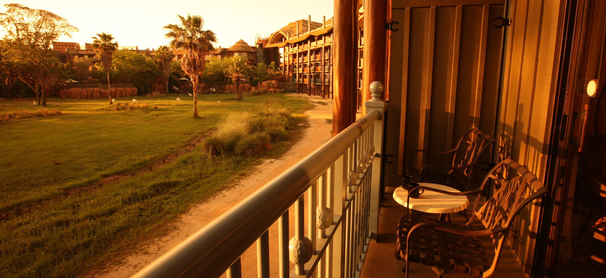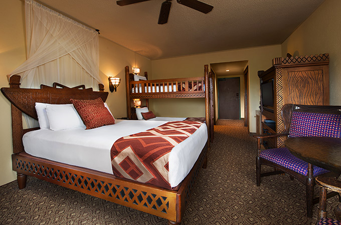 At over 11,000 square feet, the Uzima Springs pool is the largest on Disney property. A 67-foot long slide and kiddy wade pool area is also available for guests. The Uzima pool is open 24 hours, but the lifeguards go off duty at 10:00 PM and the slide also closes. The resorts two spas close at midnight. Standard room amenities: Alarm clock with MP3 player, balcony or patio, mini fridge, ceiling fan, coffee maker & setup, crib: pack 'n play, hair dryer, ice bucket, in-room safe, iron and ironing board, pool towels, table & chairs, tea setup, telephone with no surcharge (charges for long-distance will apply), television, USA Today Delivery (Mon-Fri), vanity area, voice mail, Wi-Fi wireless internet