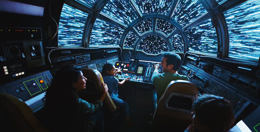 Executive Creative Director for the Millennium Falcon: Smugglers Run Asa Kalama says, “You’re truly in control of the fastest and most iconic ship in the entire galaxy. And Hondo, he’s gone ahead and added a couple extra seats so he can get as many of those flight crews through as possible. There are 200 some odd buttons, knobs and switches on the inside of the cockpit and they all do stuff.”