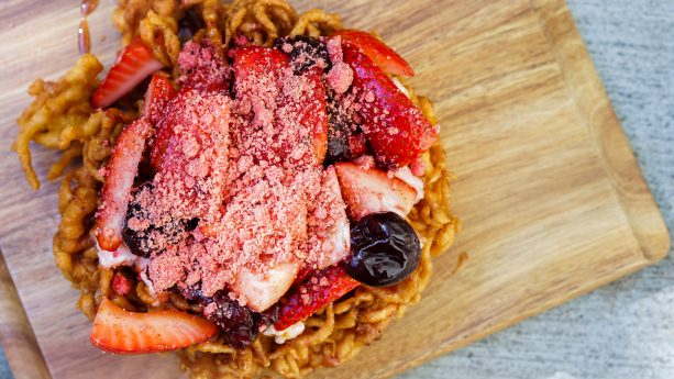 - Jessie’s Berry Jubilee Funnel Cake (House-made funnel cake topped with blueberries, strawberries, chocolate cookie crumbles, crème anglaise, white chocolate, and gold-dusted whipped cream) – Golden Horseshoe, Disneyland park