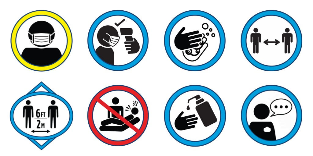 - Social distancing signs and reminders of social distancing requirements in high-traffic areas