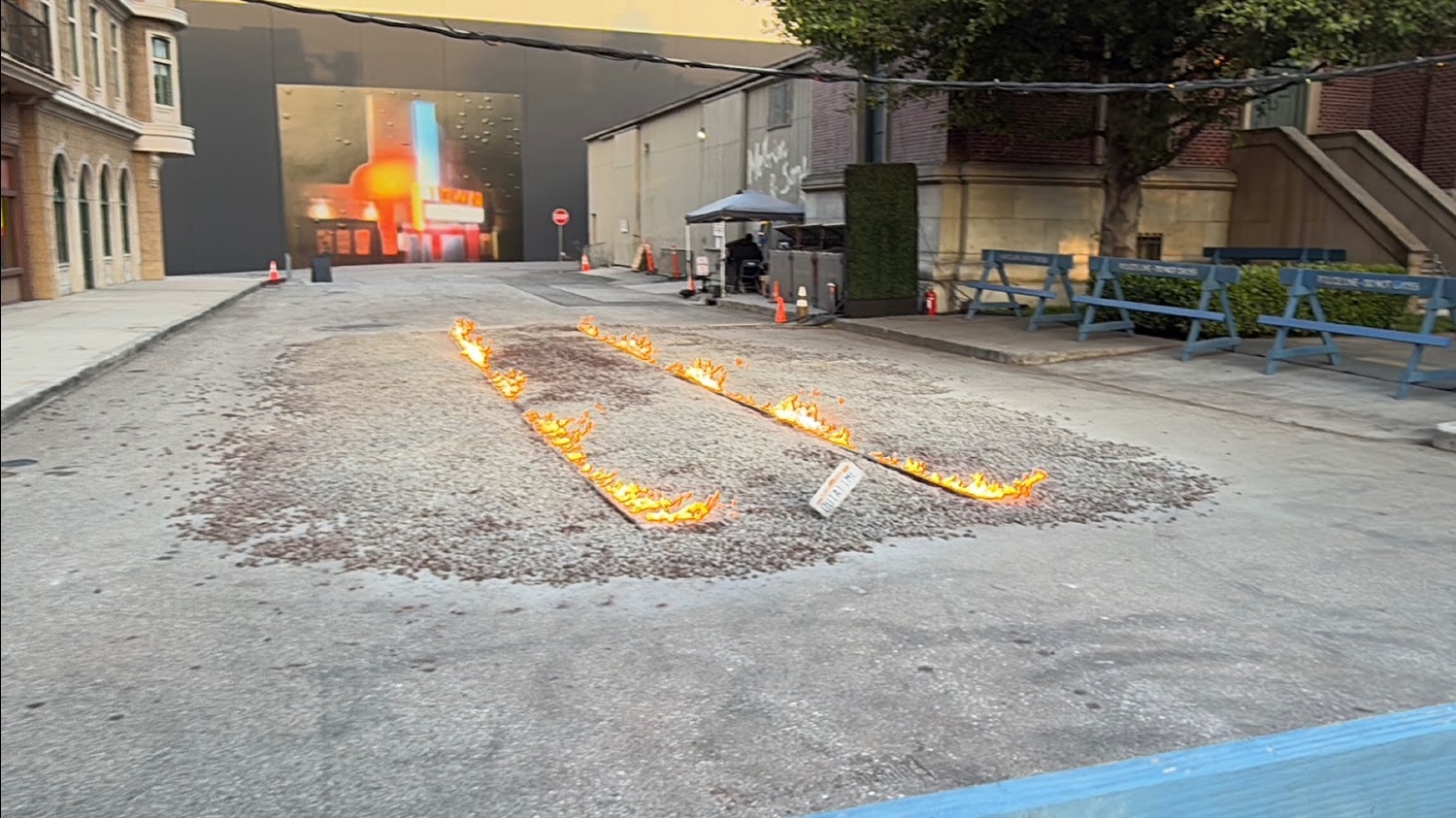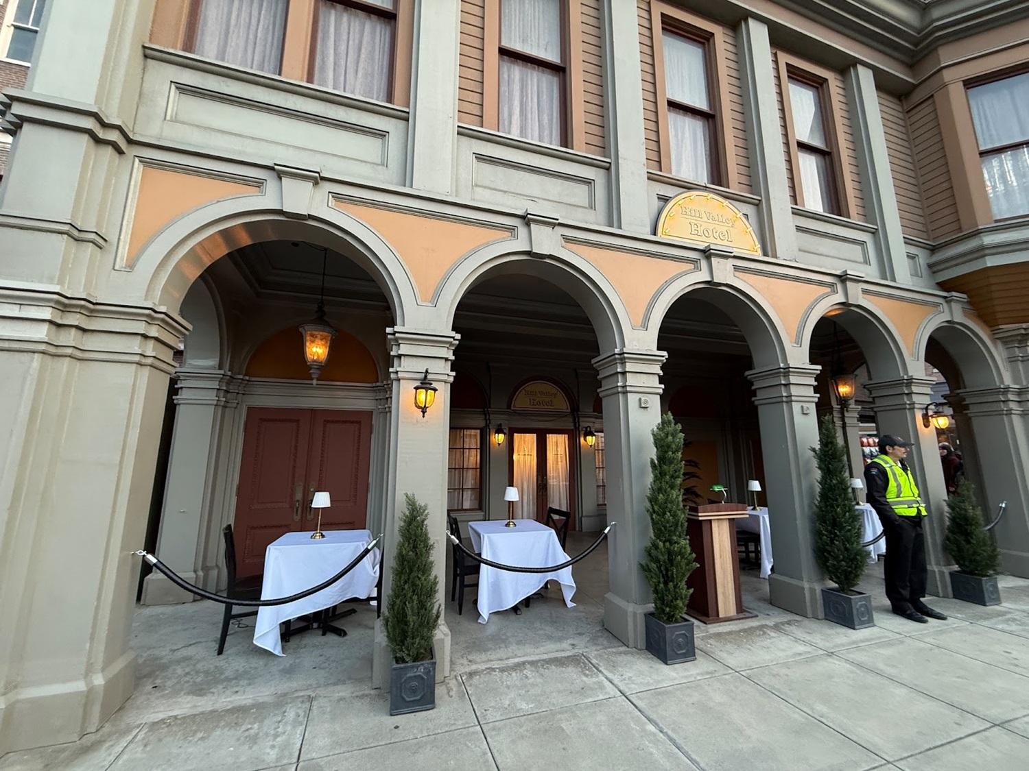 The Back to the Future: Destination Hill Valley experience begins at the entrance to the Studio Tour, as guests must board a tram to transport them to Courthouse Square on the Universal Studios backlot.