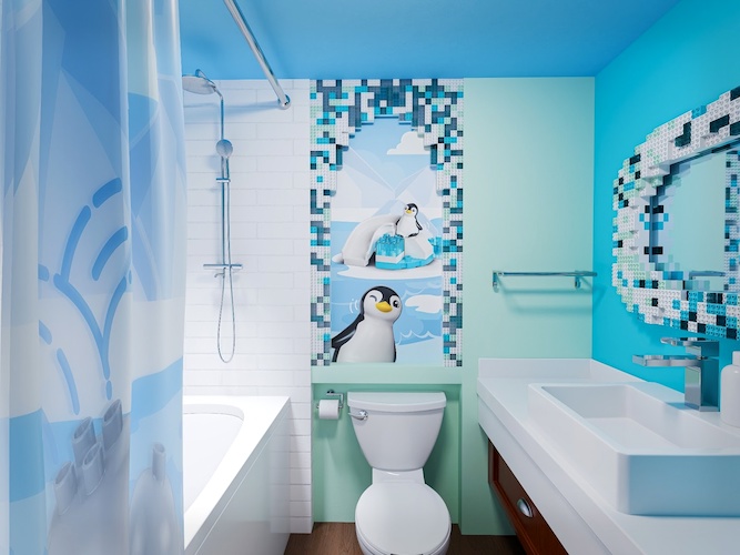 - Meanwhile, the bathroom transports families to the icy landscapes of Antarctica, where baby penguins play on snowy banks.