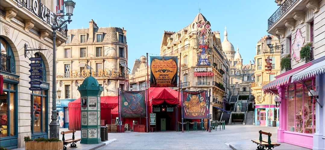 Beyond the world’s ornate portal, guests will first journey from a Muggle park in Paris into the breathtaking spectacle of 1920’s Place Cachée – a hidden, bustling shopping district in wizarding Paris lined with Haussmannian buildings, shops, sidewalk cafés, and historic Parisian domes rising in the distance.