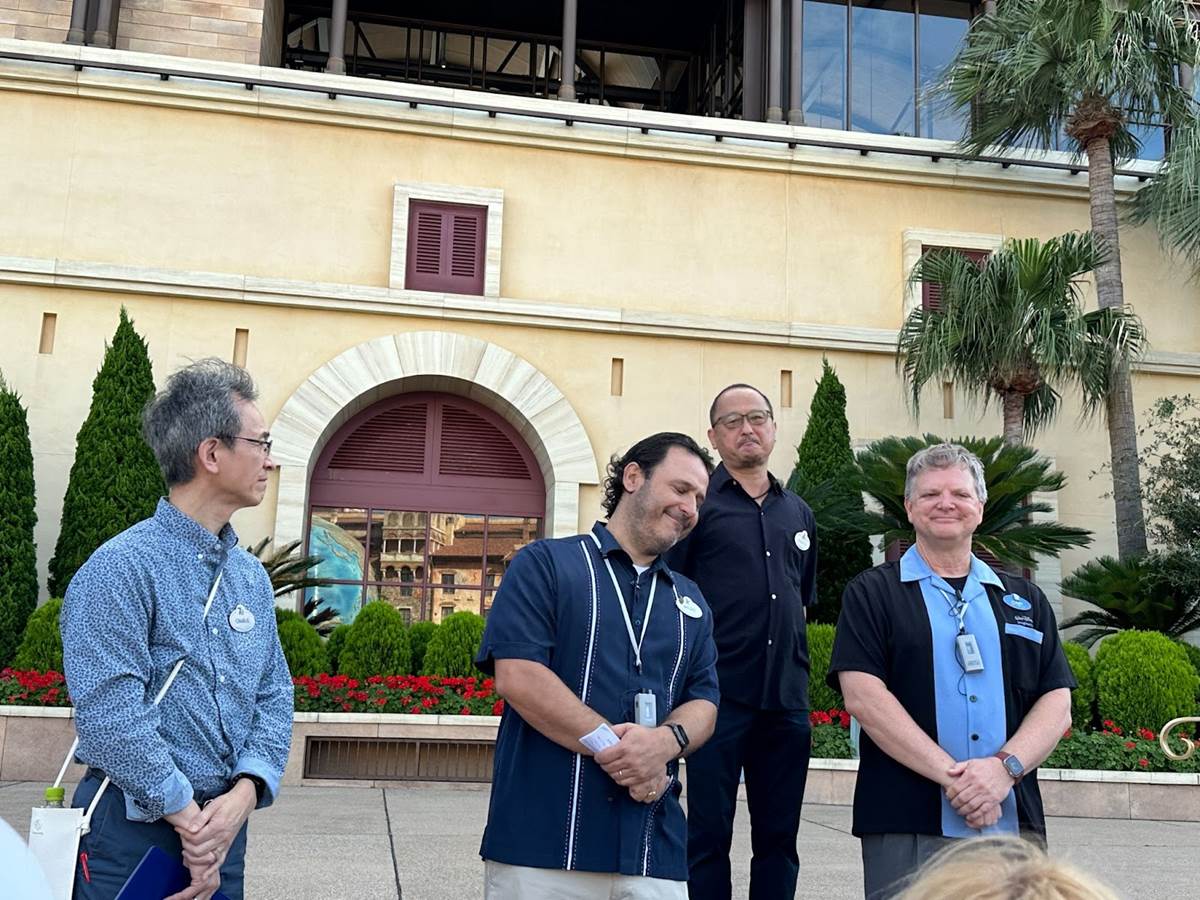 Masato Shimazu (Art Director) began by welcoming us to Tokyo DisneySea and offered an overview of the park’s history. Charlie Watanabe (Story Writer) touched on the magic of the park and the special characters he helps create stories for, Duffy the Disney Bear and all of his friends. And Diego Parras and Gary Landrum (Show Awareness Producers) discussed the intricate level of detail we would all see during our time at the park.