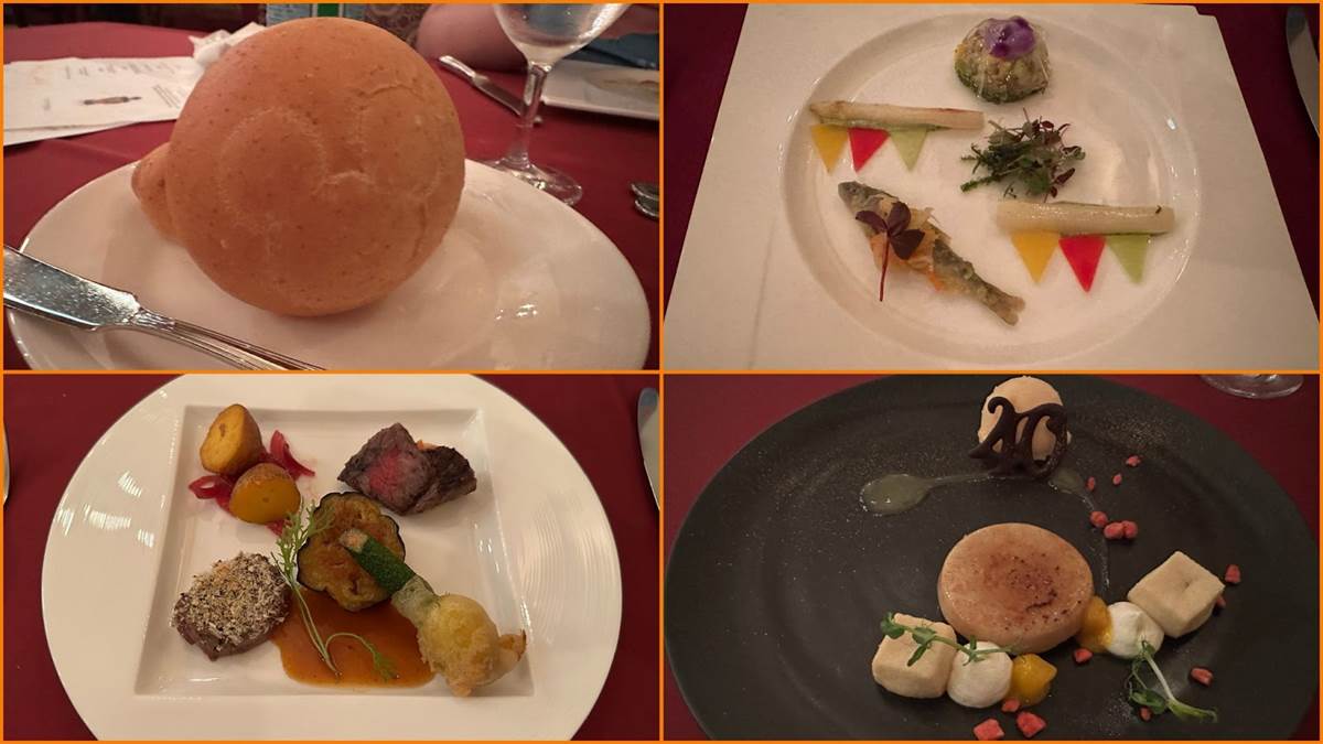 Taking the Monorail back to Tokyo DisneySea, dinner was held in Magellan’s on the Mysterious Island. Everyone received the same meal, themed to the resort’s 40th anniversary. Guests could choose between a variety of alcoholic and non-alcoholic beverages to accompany the meal, which included: