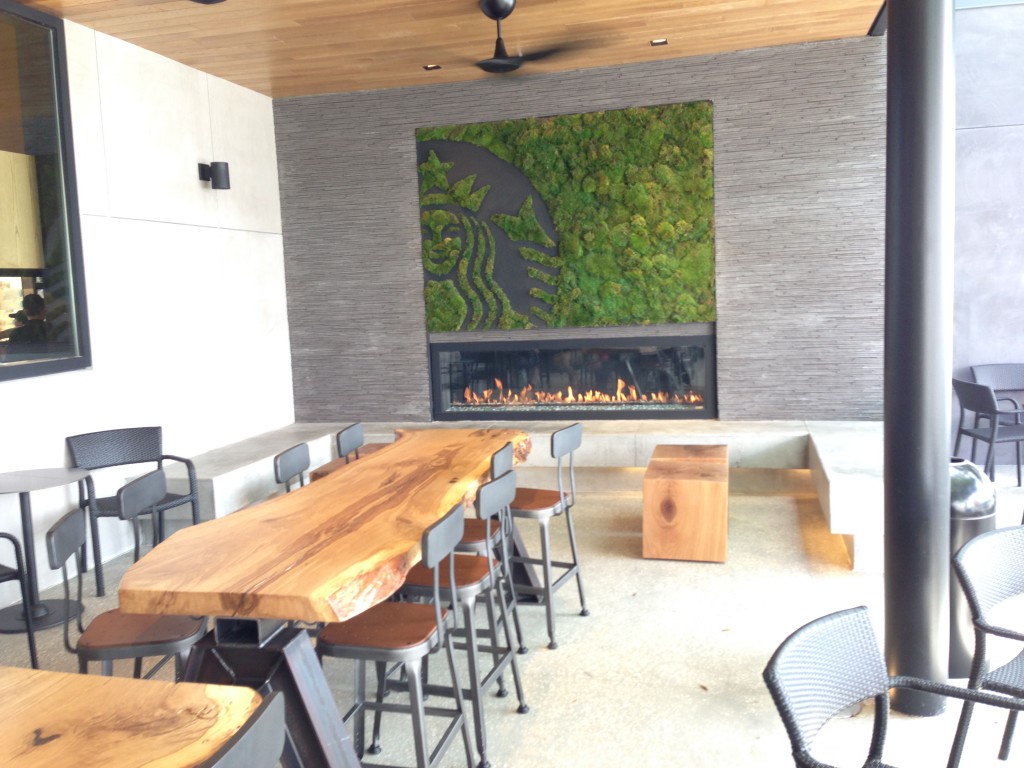 While I am not a big coffee drinker, this is a location will be a place many will go to just sit and enjoy at any time of the day or night. Hours will be, as of right now, 10am - midnight with a beautiful back patio with a fireplace for those "cold" florida nights. Also notice the benches and tables made from reclaimed wood and the live moss logo above the fireplace.