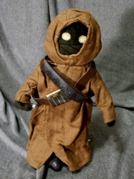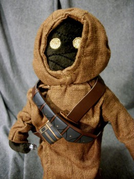 This little guy stands 10 inches tall and is loaded with detail! His robe is made of a soft brown woven fabric. His eyes and the bandages that wrap the Jawas face are embroidered, and his feet and pouches have printed detail.