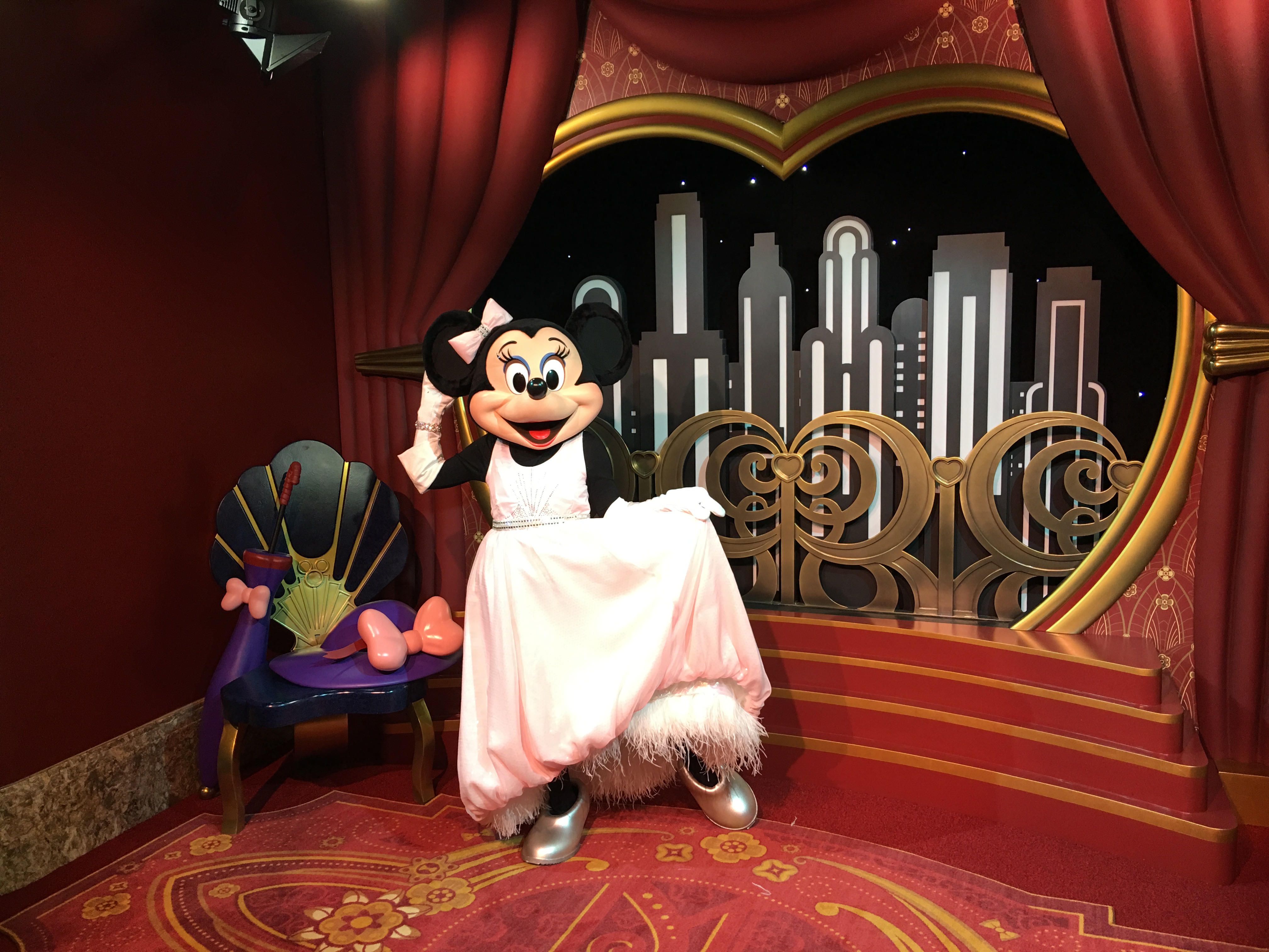 First up is Minnie Mouse is her lavish set right out of a classic film.