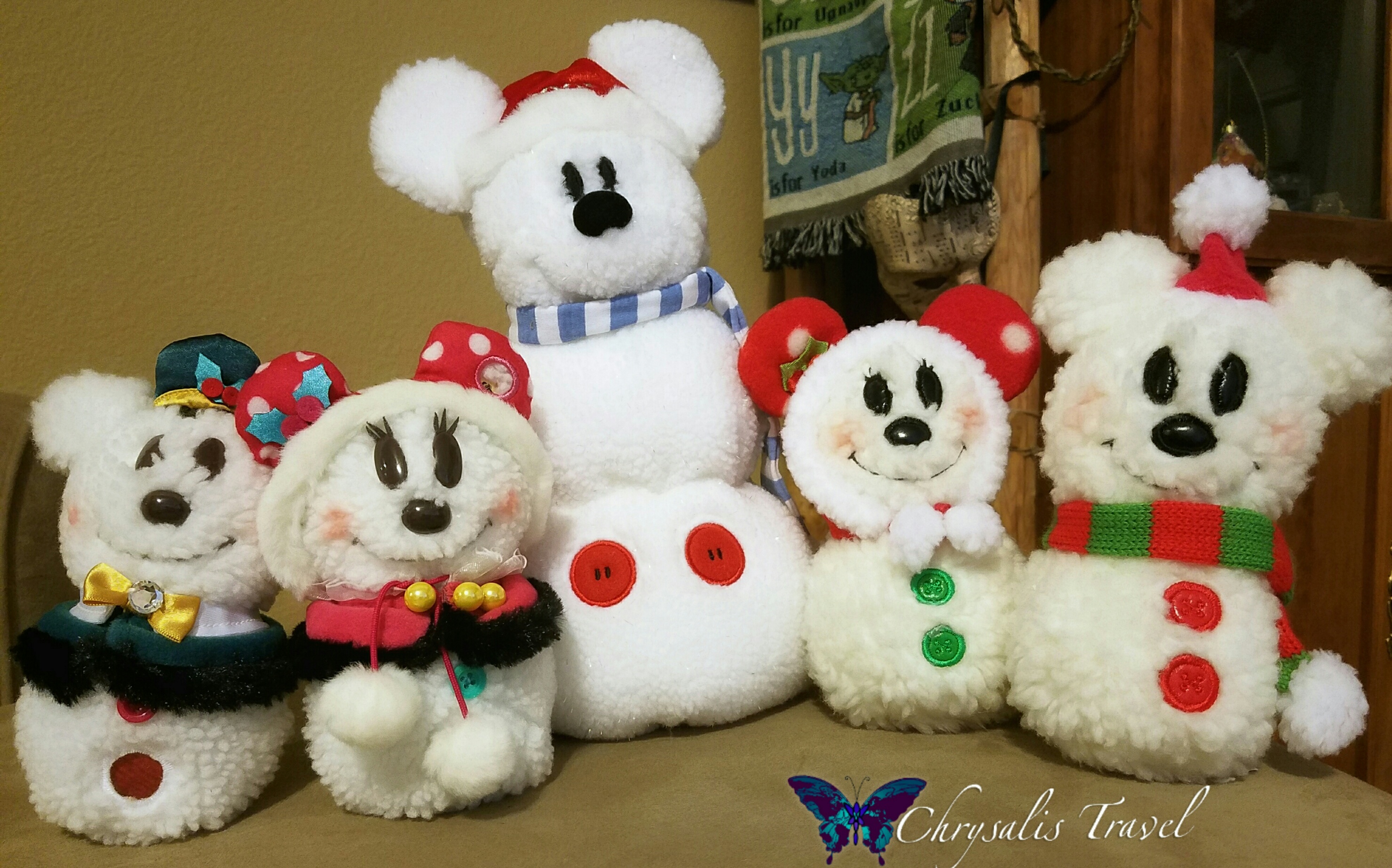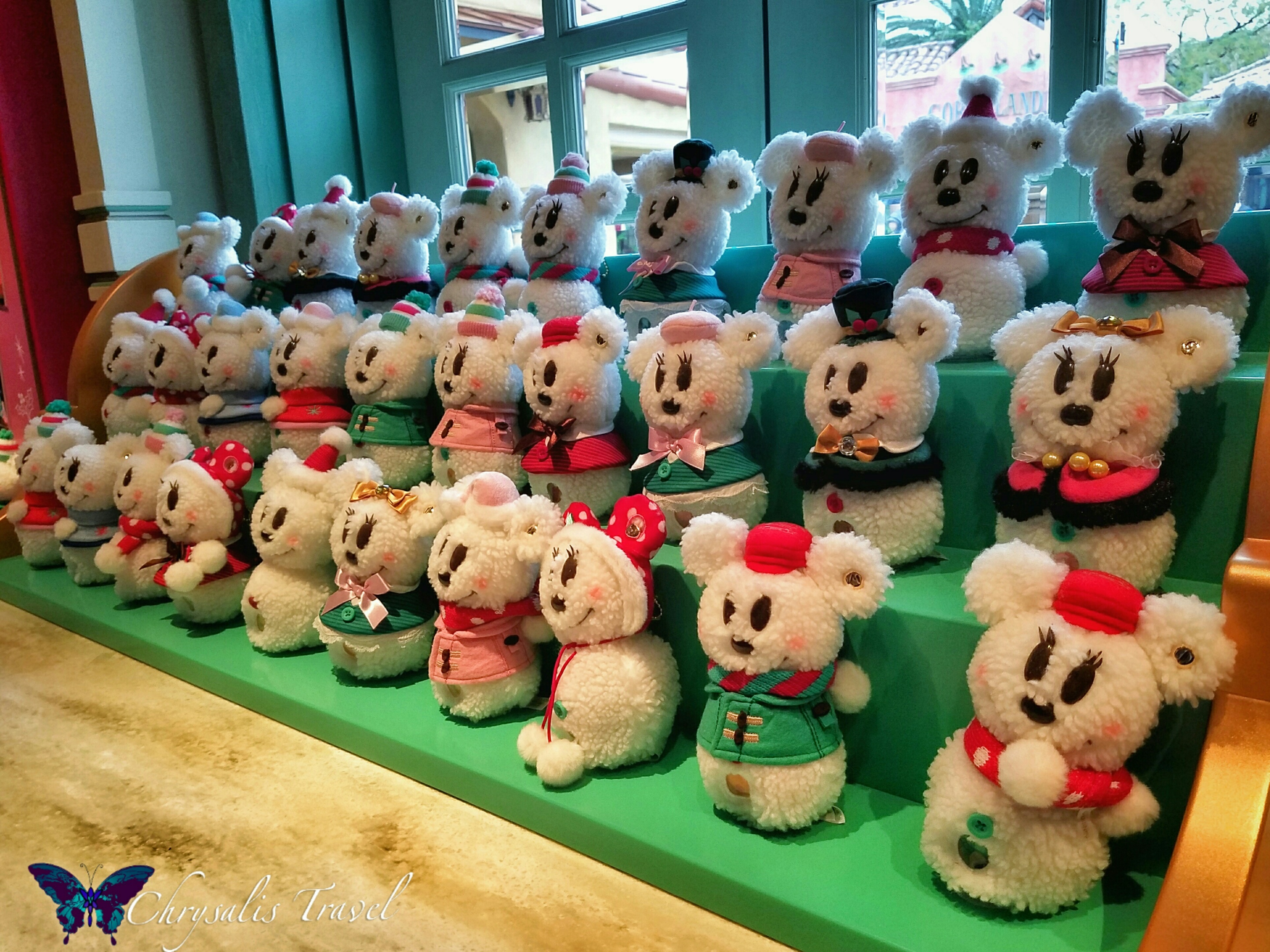 Huey, Dewey, and Louie (in their stockings from the Tokyo Disneyland parade) make a great set of dangles. Chip and Dale are very popular characters in Tokyo. They’re ready to go caroling in their snow outfits.