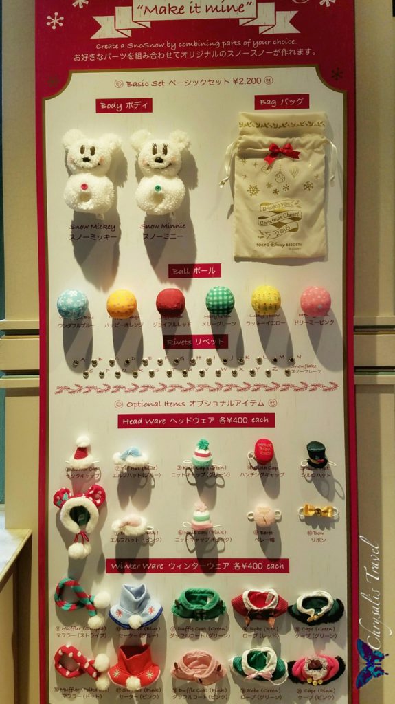 There are so many variations of SnoSnow merchandise. The most popular is the customizable “Make it mine” SnoSnow Mickey and Minnie. For 2200 Yen (about $22 USD), you start with either a Mickey or Minnie body.
