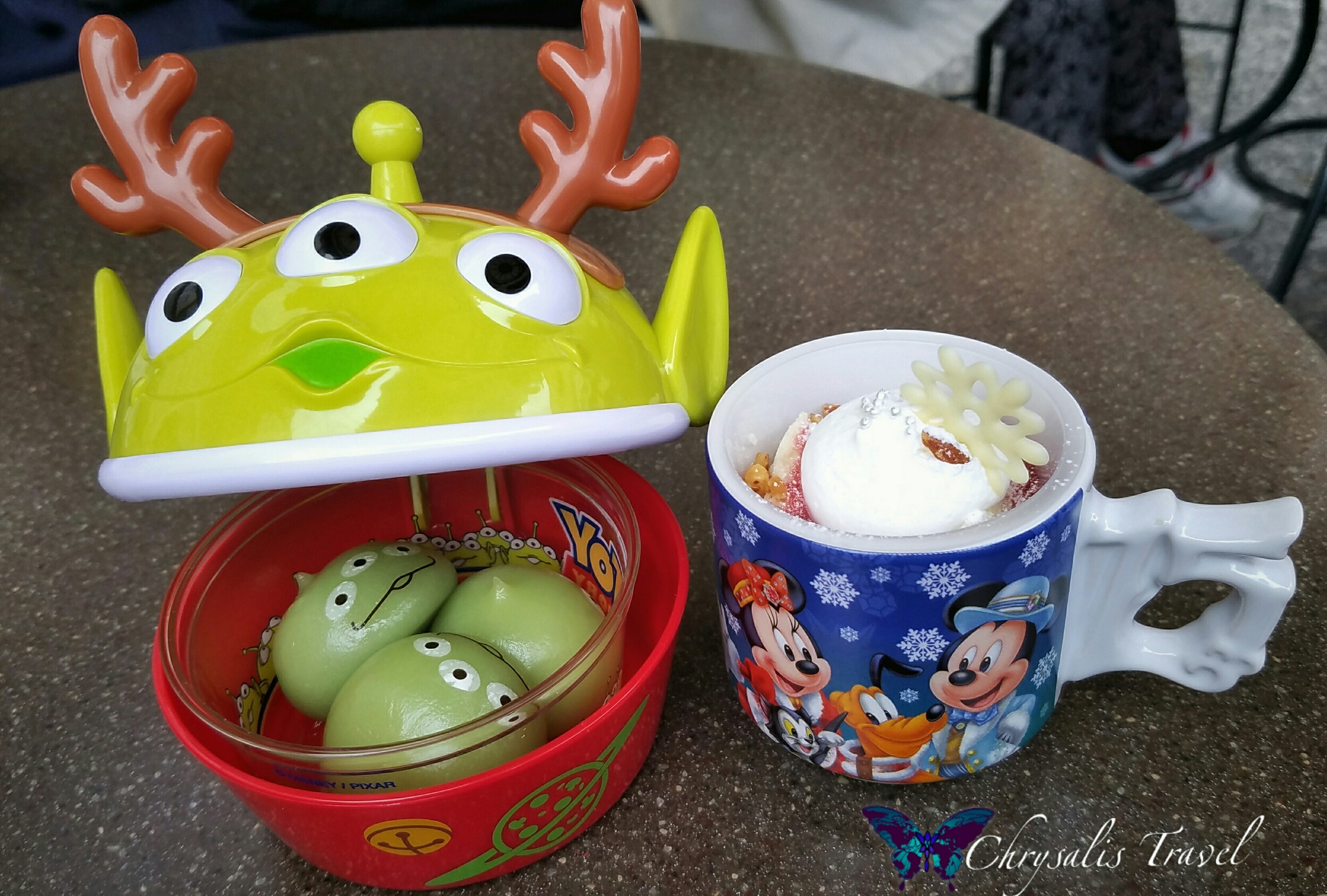 Tokyo DisneySea’s 15th Anniversary has generated many themed collectible items. Here is the Christmas dessert cup with “15” molded into the handle. Honestly, every food concoction that we tried at Tokyo Disney has been delicious. Even if it looks or sounds unusual, it is worth a try.
