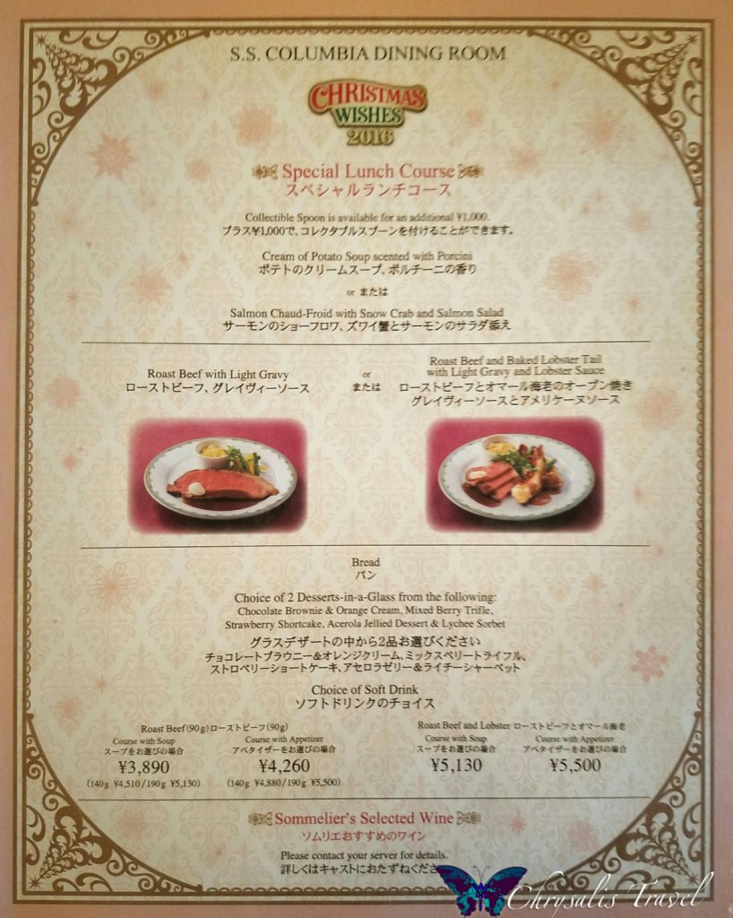 The Tokyo Disneyland Hotel was dressed in sophisticated style for the “Christmas Fantasy 2016.” Each Tokyo Disney Resort hotel also has special menus during holiday seasons.