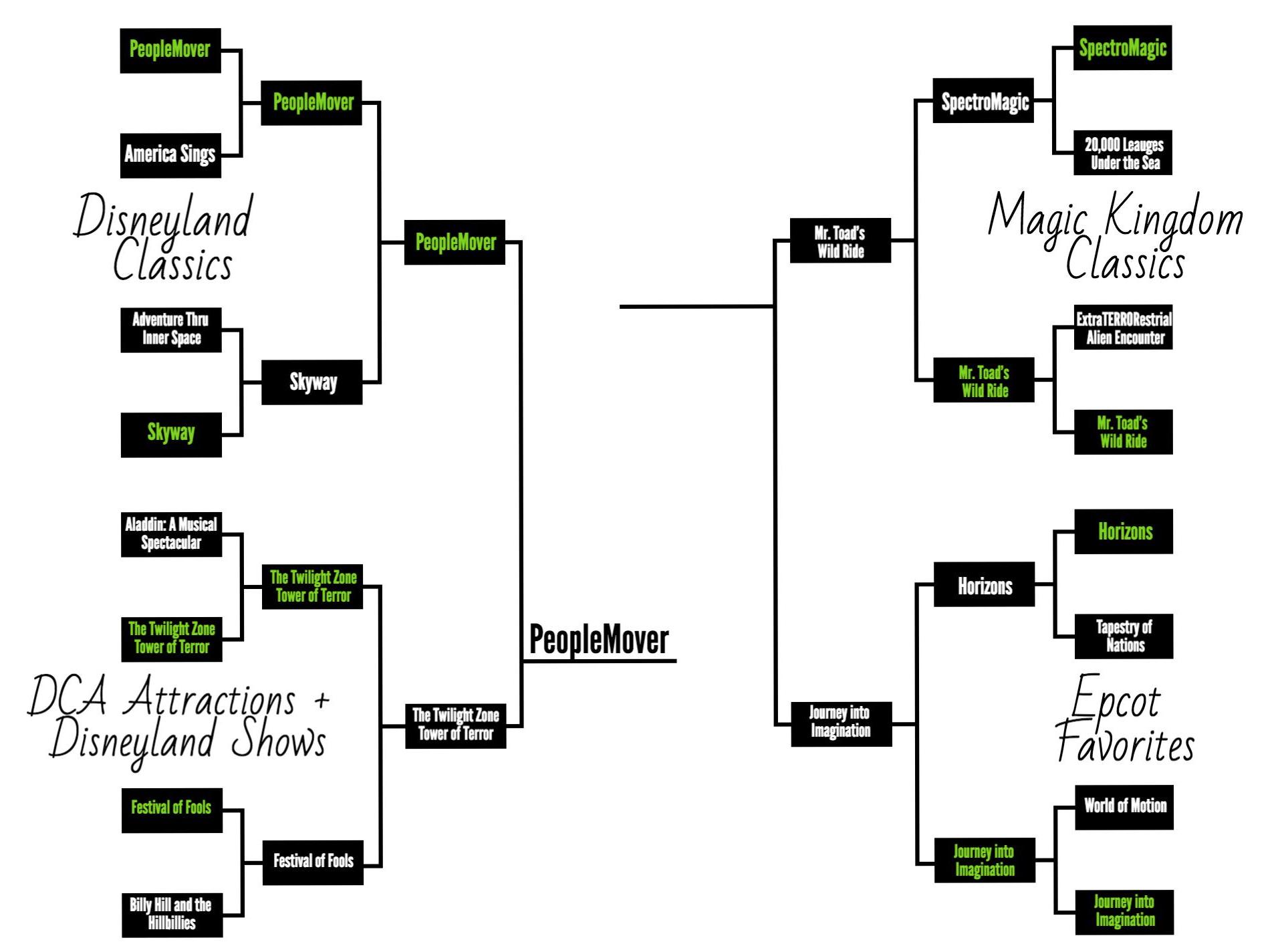 In yesterday's semi-finals match-up, Disneyland's PeopleMover defeated DCA's Tower of Terror and will represent the West Coast in the finals: