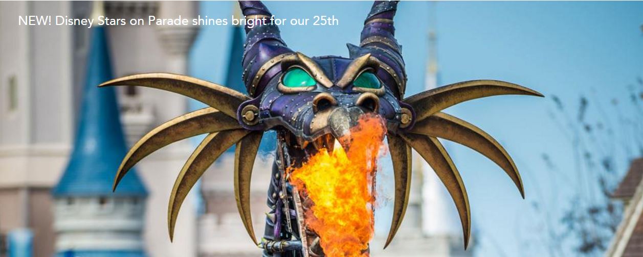 Two words: fire-breathing dragon. The 25th Anniversary parade showcases Maleficent dragon (resembling the one at WDW). The promotional photo on the Disneyland Paris website is actually the dragon from WDW’s Festival of Fantasy parade, with Cinderella’s castle visible in the background.Here is a side-by-side comparison of the two dragons. Maleficent from WDW is on the left, with more of a thorns-and-armor design. Maleficent from DLP is more fleshed out in the wings and ears flaps, and decorated in more graceful motifs.