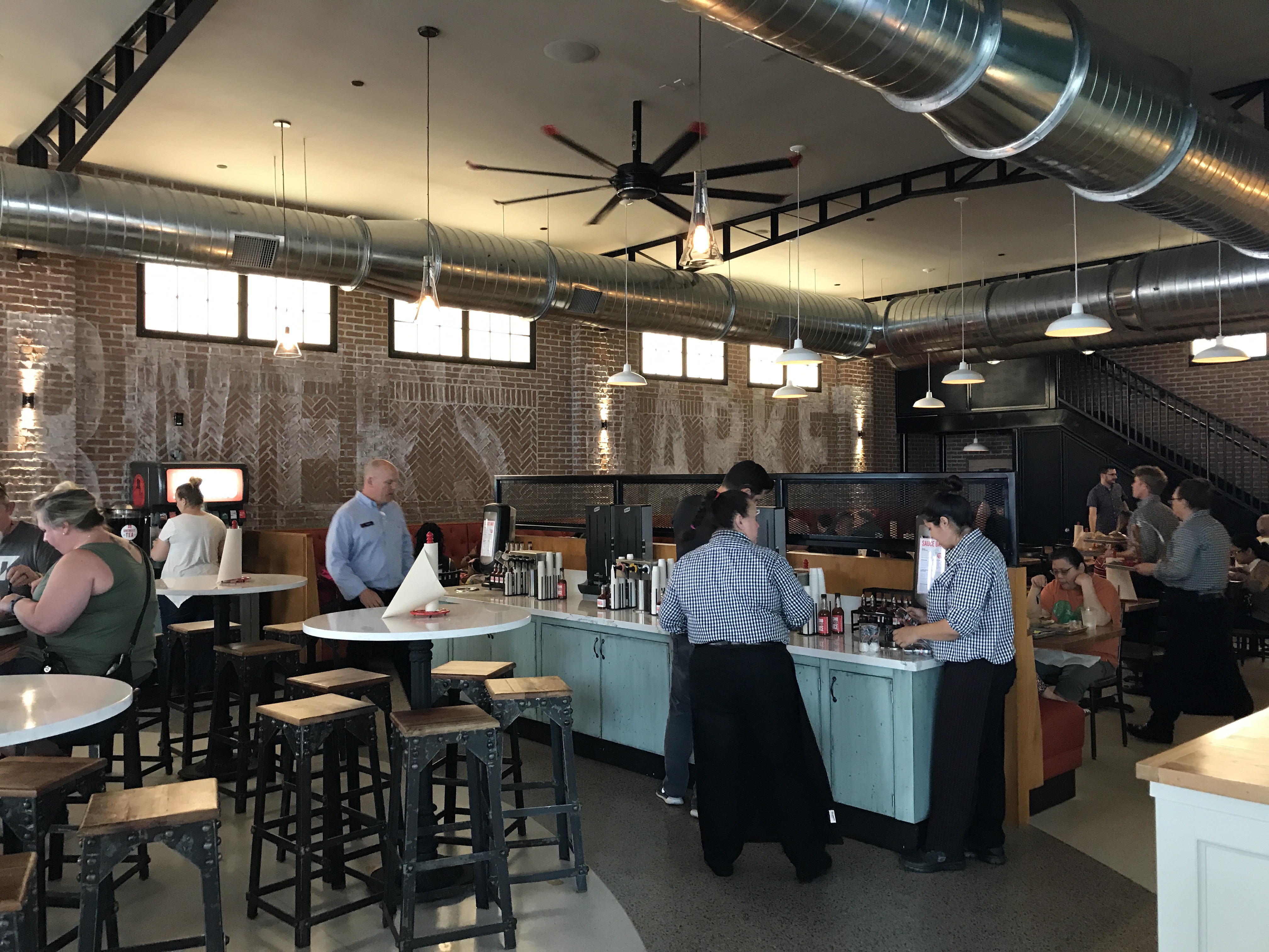 Guests can either order at the counter and are giving a GPS puck for their food to be delivered to their table or sit at the bar and enjoy a cool drink while waiting for the food.
