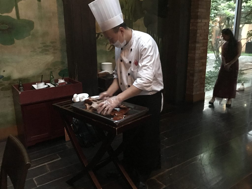Dinner was served family style and featured more courses than I could count. The headlining item was the Peking Duck. Following dinner, we could enter the kitchen to see how the duck was prepared and then cooked in a wood-burning oven. Of course, we were also given our pin of the day, which did not feature Donald.