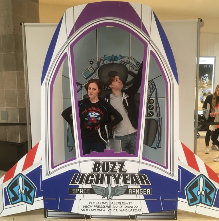 After the initial greeting we continued to the exhibit where there were several large backgrounds featuring concept art for Toy Story Land. There were also three photo spots that we had to check out. The first was standard picture in front of a blank background. Not exciting at all, but wait, there's more! We were told to pose looking up as if the claw was reaching down to grab us! After our "photo shoot" we saw the interactive digital clip: the claw reaches down and pulls up our picture. We then opted to have the clip sent to our email address as a keepsake. Here are our other pictures:
