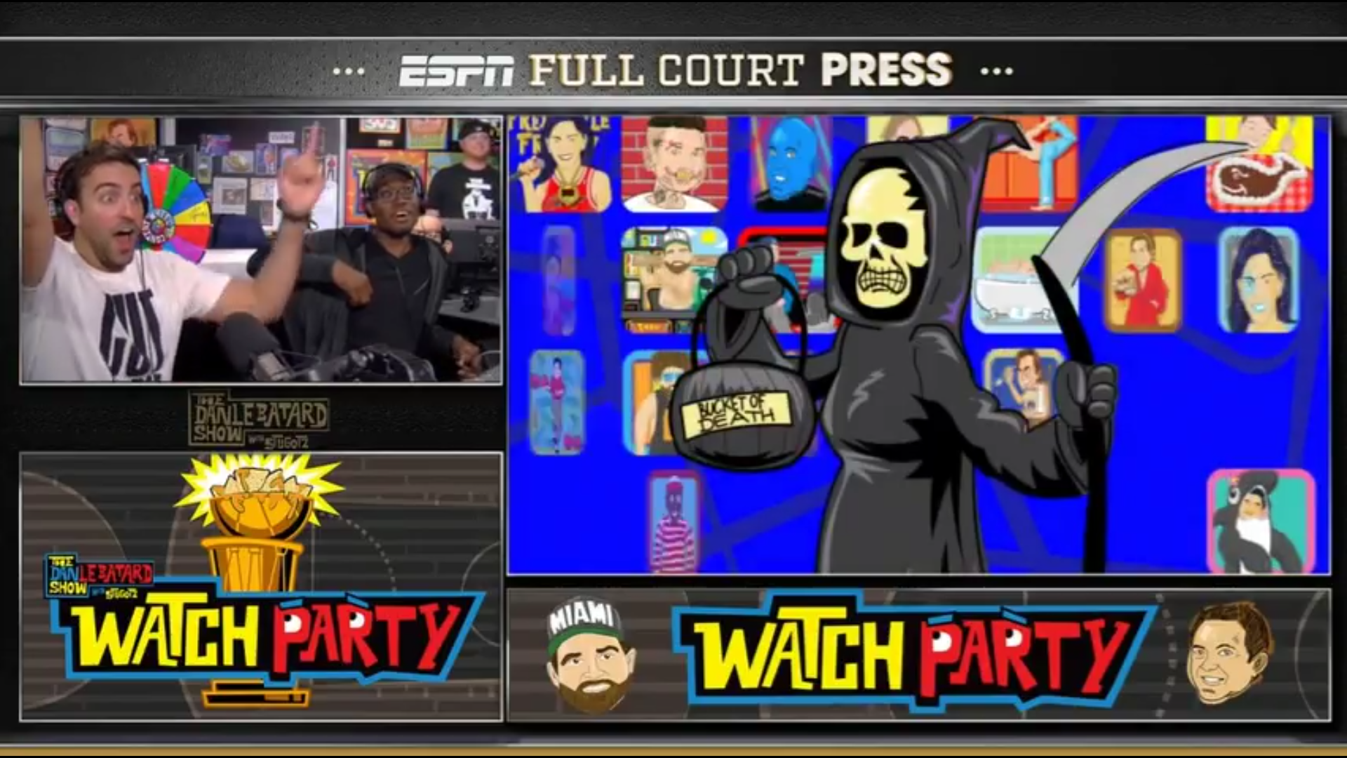 During the Football season, Le Batard, Stu and the studio crew randomly pull a helmet from “the bucket of death” if that team loses they choose some sort of humiliation from the “grid of death.” We’ve seen them dress as various celebrities, dunk in an ice bath, eat pickled pigs feet or a raw onion like an apple.
