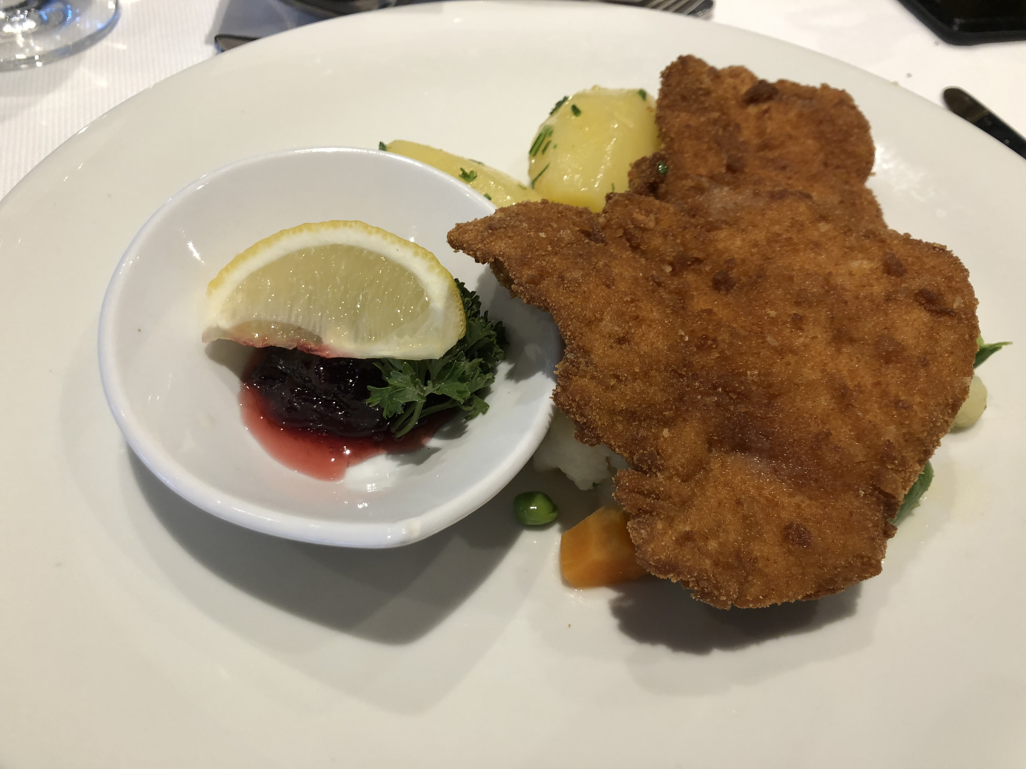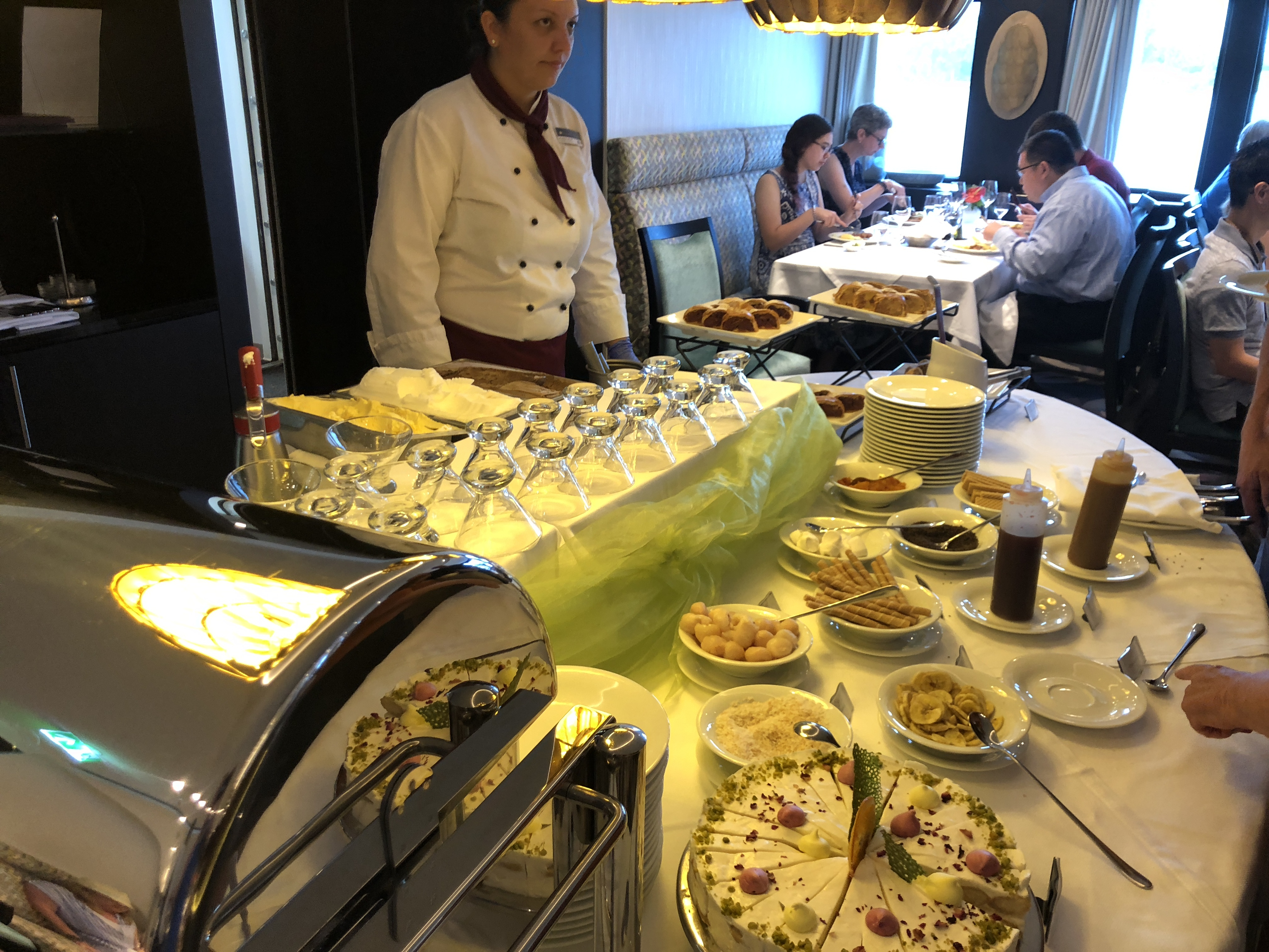Since there were evening activities, there was an Early Dinner Viennese Buffet at 5:45 served in the main dining room. There was not a Junior Adventurers option so everyone ate in the main dining room. I was happy to see that even with everyone on board eating, the dining room never felt crowded. The once exception to the buffet service was the schnitzel, pork or turkey, which was ordered through the waiter, and worth the wait. Of course there was strudel for dessert.