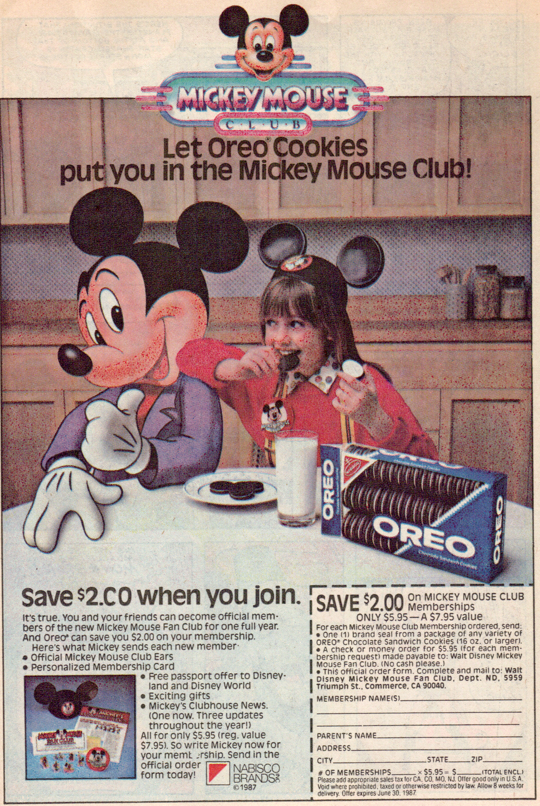 In the late 80's, Oreo allowed kids to join the official fan club of The New Mickey Mouse Club (MMC) through a mail-in campaign.