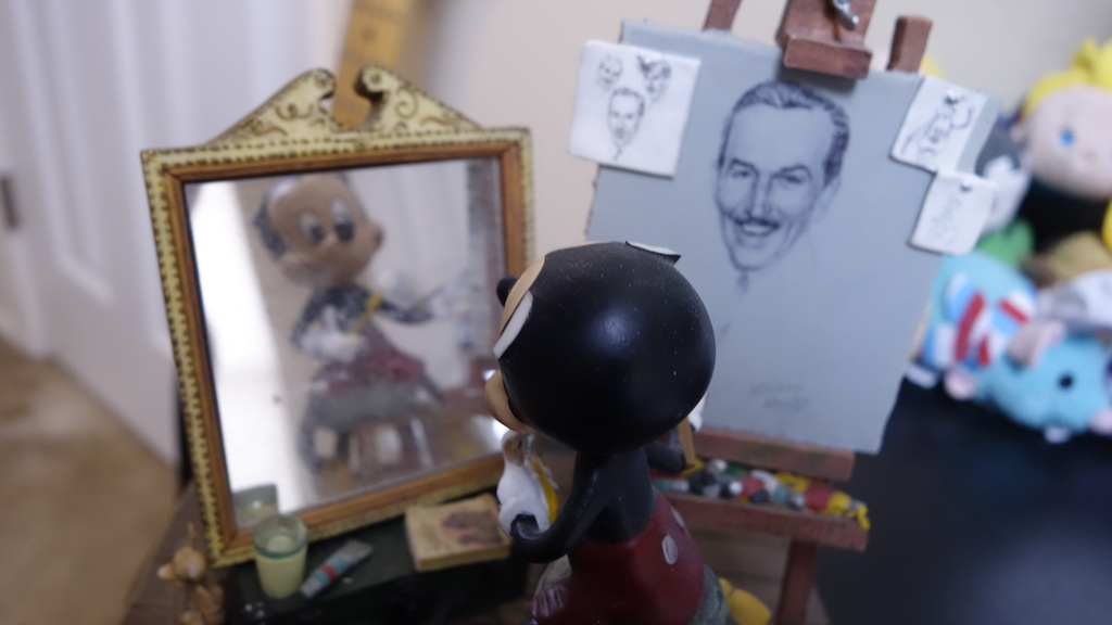 Speaking of desks, this figure wasn’t always so worse for the wear, but has incurred some damage over the years thanks to multiple moves. Despite the fact that Mickey no longer has any ears, this is still one of my favorites for multiple reasons. First, from the moment I saw this on display at Off the Page in the then-named Disney’s California Adventure, I was taken with how clever the homage to Normal Rockwell’s “Triple Self-Portrait” was — including the twist where Mickey is sketching Walt. My father felt the same and, before our trip ended, he decided to buy it for me as a gift. As luck would have it, I had just secured a promotion at work and would now have my own desk, so naturally this graced the corner of it for some time.