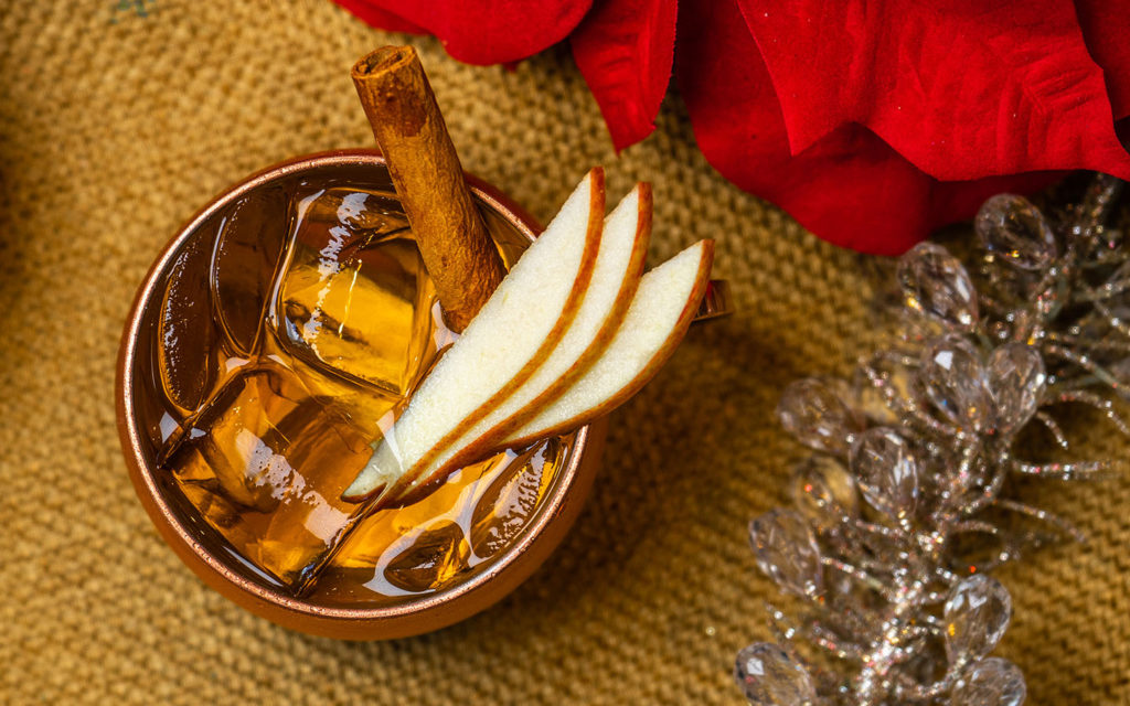 At Lombard's Seafood Restaurant in Universal Studios, guests can partake in the Apple Cider Irish Mule, containing Irish whiskey stirred with apple cider, topped with ginger beer and a cinnamon stick and apple slices for garnish.