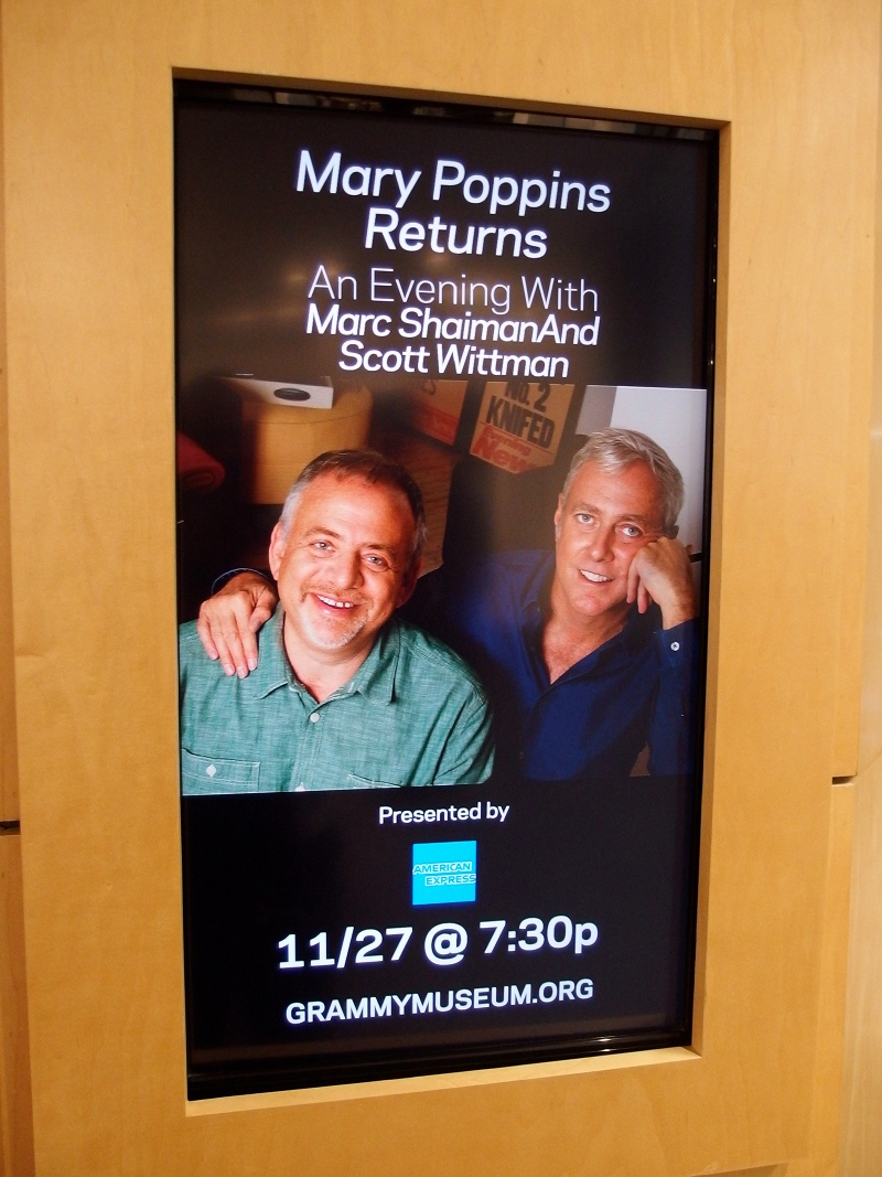 The occasion was An Evening With Marc Shaiman and Scott Wittman at the Clive Davis Theater in the Grammy Museum in Los Angeles. In the intimate setting host Scott Goldman, Artistic Director of the Grammy Museum coaxed not only stories but seven songs from the new film (plus one that was deleted) from the duo. The playlist for the evening included: “Underneath the Lovely London Sky,” “Can You Imagine That,” “Turning Turtle,” “A Cover is Not the Book,” “The Place Where Lost Things Go,” “Trip a Little Light Fantastic,” “Nowhere to Go But Up,” and “The Anthropomorphic Zoo” (a number written for the film but ultimately not used).