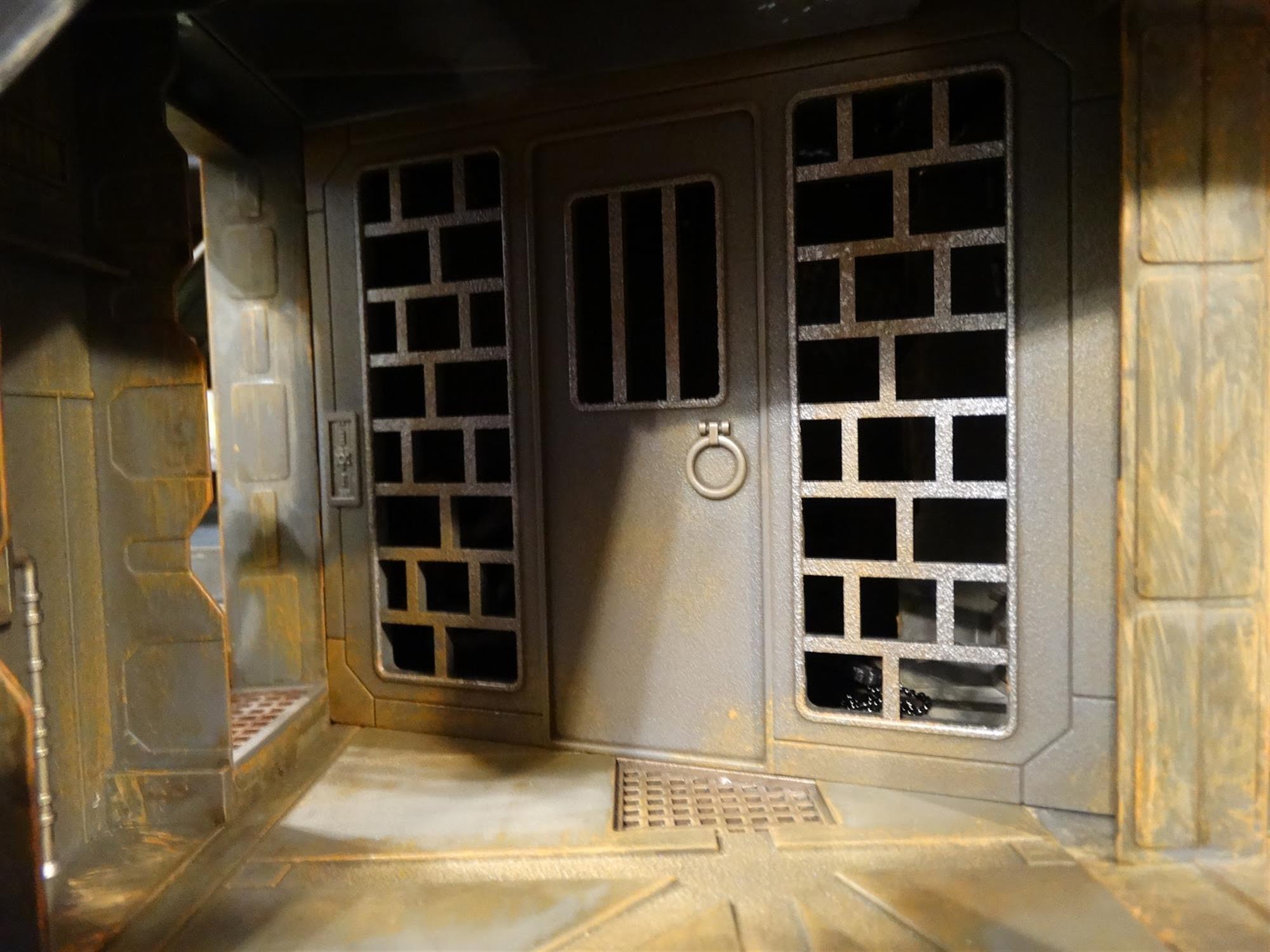 My favorite aspect of the Khetanna’s interior, however, has to be the jail cell. A trap door from the above deck drops down into this dingy dungeon, which I was shocked and delighted to find holds the rotting corpse of an Ithorian, who must have been long locked away and forgotten by Jabba’s Gamorrean guards. The jail door manually slides open and closed to allow human hands access into the detention area of the ship.