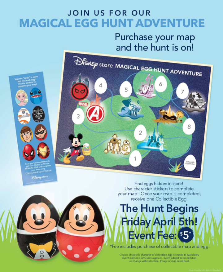 Heading to the Disney Store? Guests can purchase a collectible map at their local stores and the hunt is on! The in-store purchase also includes stickers to complete the eight hidden eggs on the map and an exclusive Minnie Mouse or Mickey Mouse collectible egg. This special adventure experience starts on April 5 and is available at select Disney Store locations.