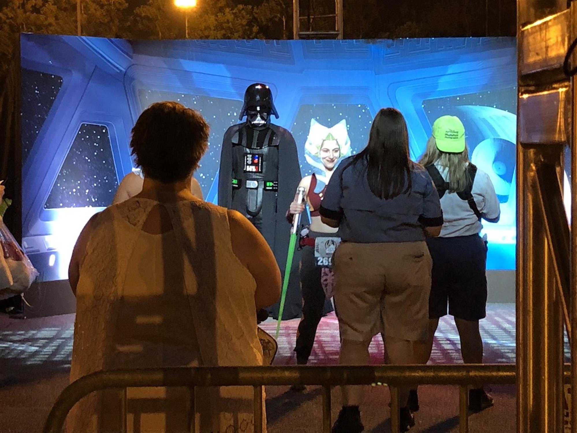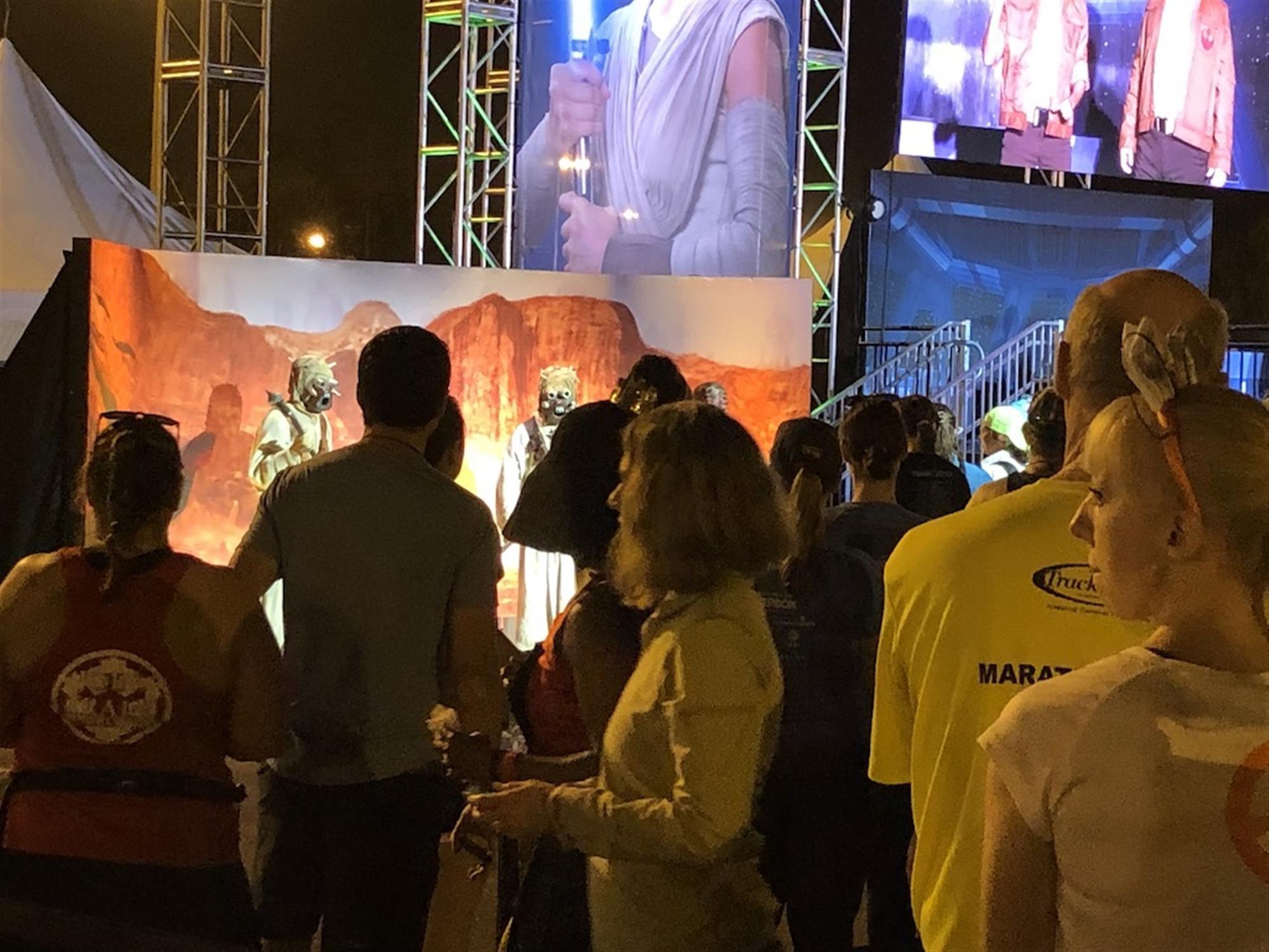 Saturday morning, we woke up early and drove to Epcot to take transportation to the start line at Magic Kingdom. This was an elegant and streamlined system, and Disney had plenty of Cast Members and volunteers directing runners to busses. There was a lot of activity already taking place at the Magic Kingdom parking lot. Runners were visiting the coffee truck to purchase pre-race snacks and caffeine, taking pictures with Star Wars characters, and getting psyched for those 6.2 miles!