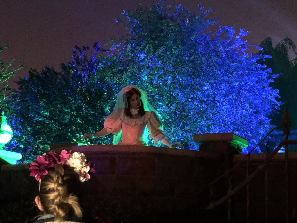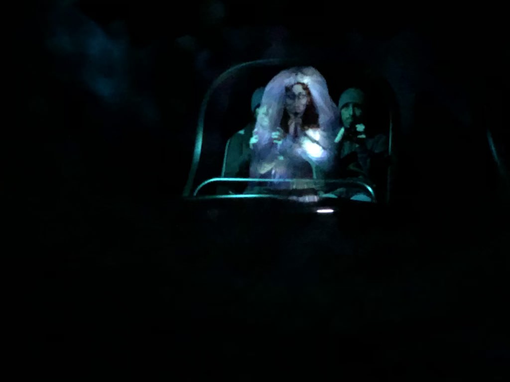 - The Bride aka Melanie Ravenswood is now part of the loading area. She stands facing an enormous window, creating a spooky start to the ride.