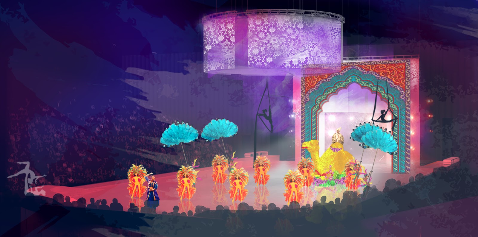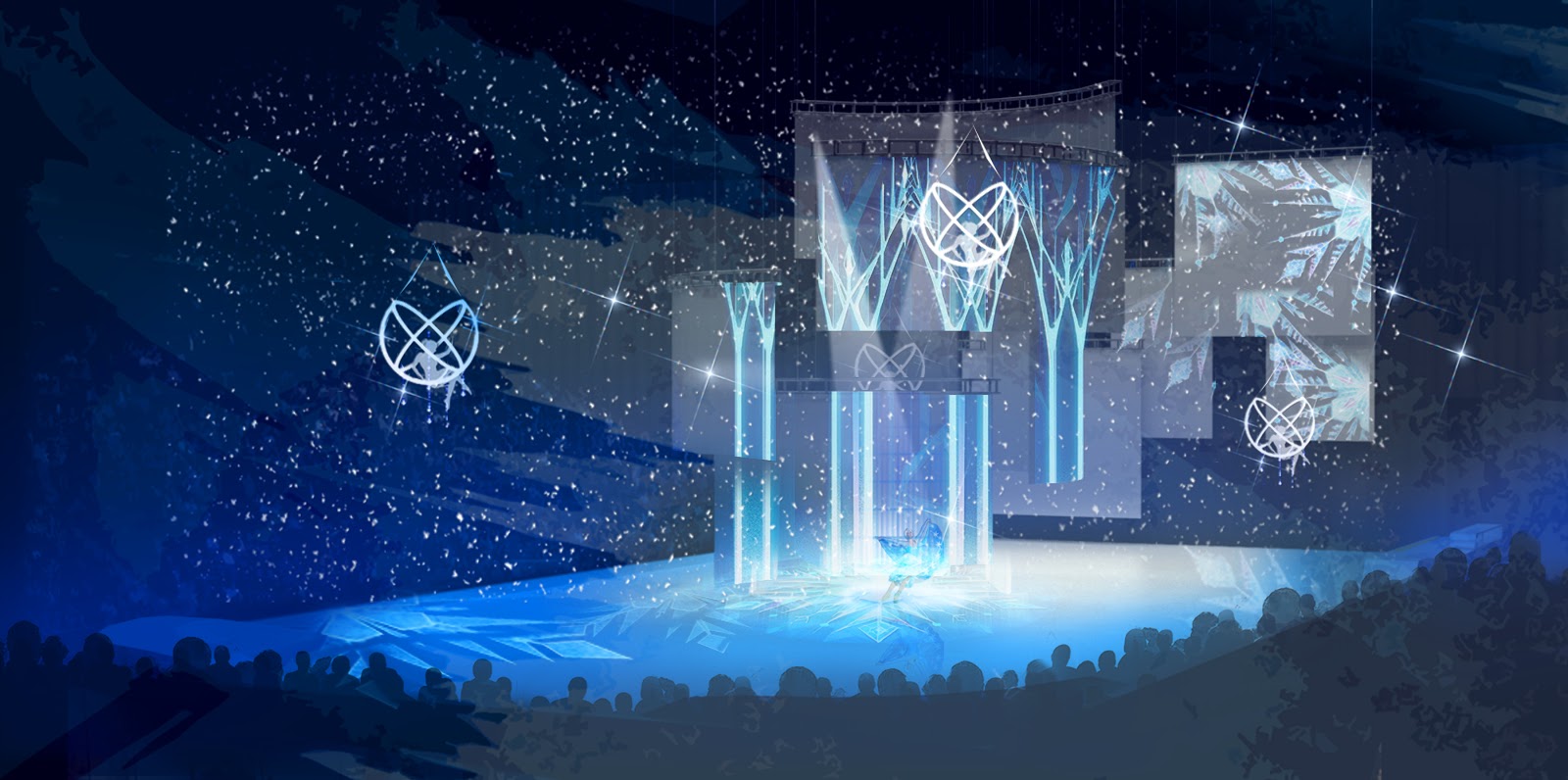 The Prince Ali parade which be awash in bold colors and opulent costumes will enhance the athletic choreography and performers demonstrating extreme flexibility in the regal procession. Elsa from Frozen will also show off the depths of her power as the arena is transformed into her ice palace with the use of scrims and LED panels.