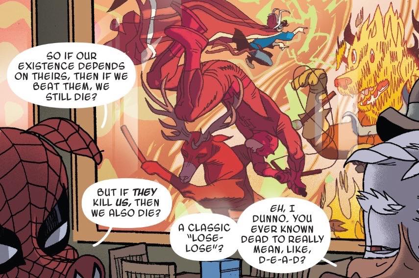 Countless animal puns flash in the background of this story, including Meows Morales, who actually gets a couple of lines in. Porker and Howard even discuss the 1986 film Howard the Duck.