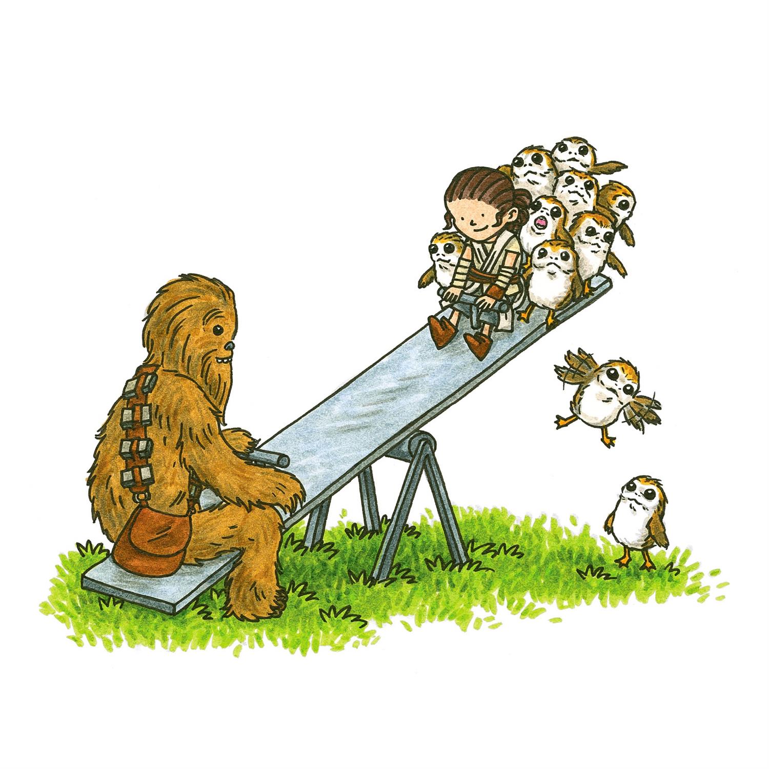 Now Brown has taken a leap forward in time to the Star Wars sequel trilogy era with the new Star Wars: Rey and Pals hardcover collection of humorous drawings and comic strips featuring Rey, Kylo Ren, Finn, Poe Dameron, Rose Tico, Admiral Holdo, BB-8, Porgs, and other characters in silly situations inspired by the films Star Wars: The Force Awakens and Star Wars: The Last Jedi.