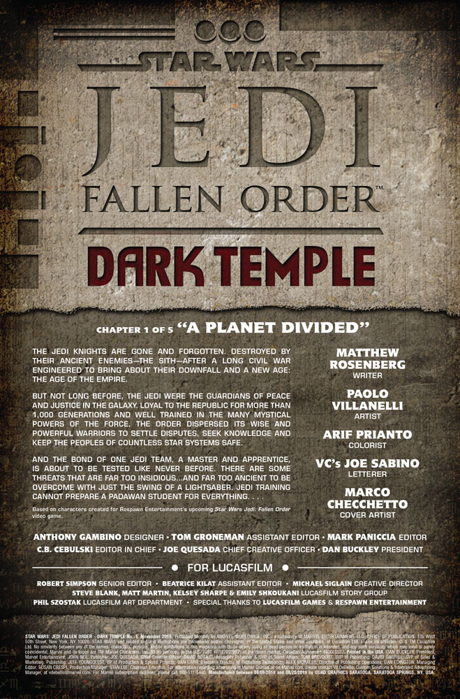Star Wars: Jedi - Fallen Order: Dark Temple issue #1 is available now wherever comic books are sold. Star Wars: Jedi - Fallen Order is scheduled to be released on Friday, November 15 for PlayStation 4, Xbox One, and PC.