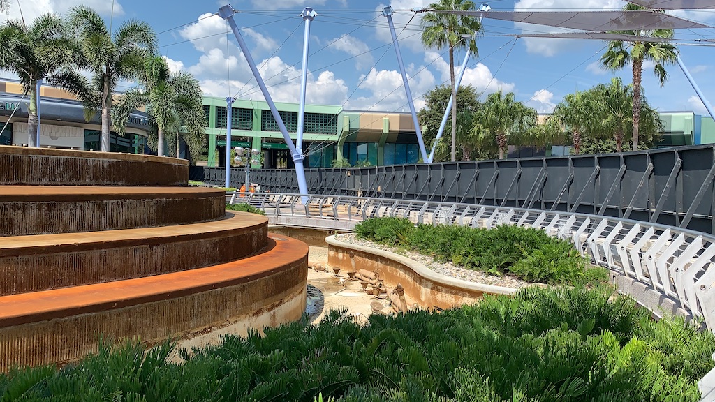 The walls extend around part of the Fountain of Nations. Additionally, the water has been shut off and the fountain drained.