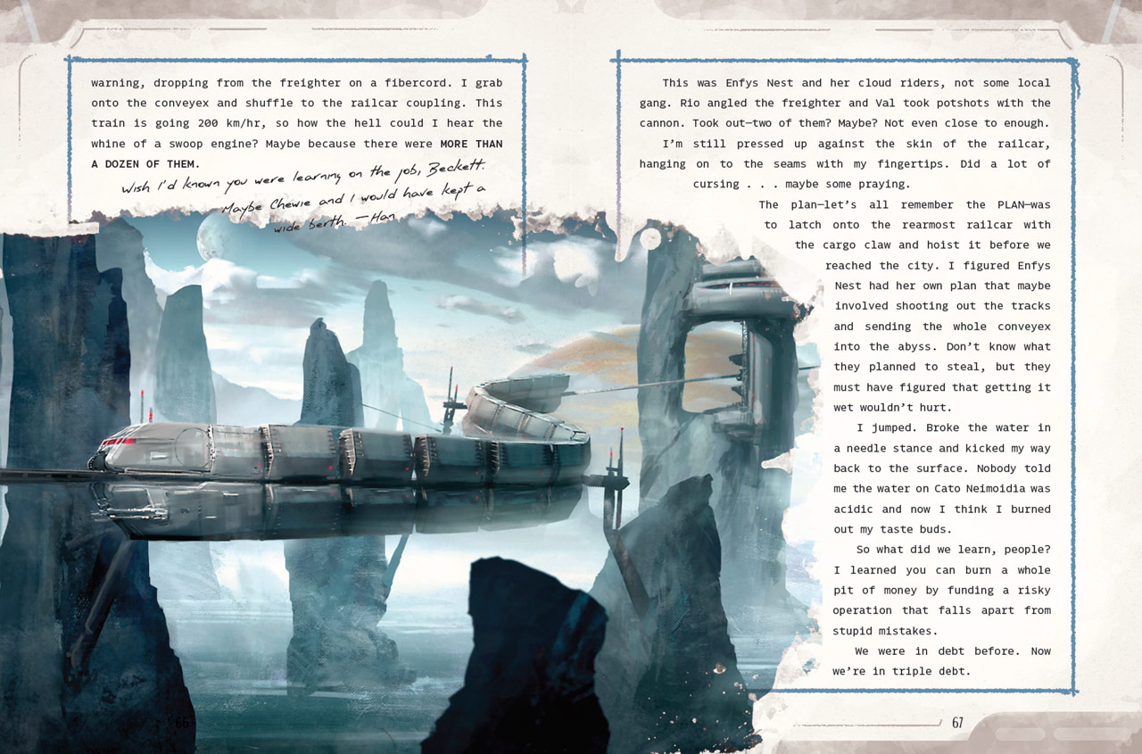 From the early days of the Galactic Empire through the time of the Rebel Alliance and through to the appearance of the First Order, the reader tracks the journal through dozens of owners-- from Dexter Jettster to Hondo Ohnaka to Dryden Vos to Lando Calrissian and even Han Solo-- as we get to know the seedy underbelly of the Outer Rim first-hand via smugglers, pirates, assassins, slavers, and gamblers. It’s a very different (and very welcome) method of Star Wars storytelling, and it allows for a variety of styles and formats that wouldn’t be possible with more traditional prose.